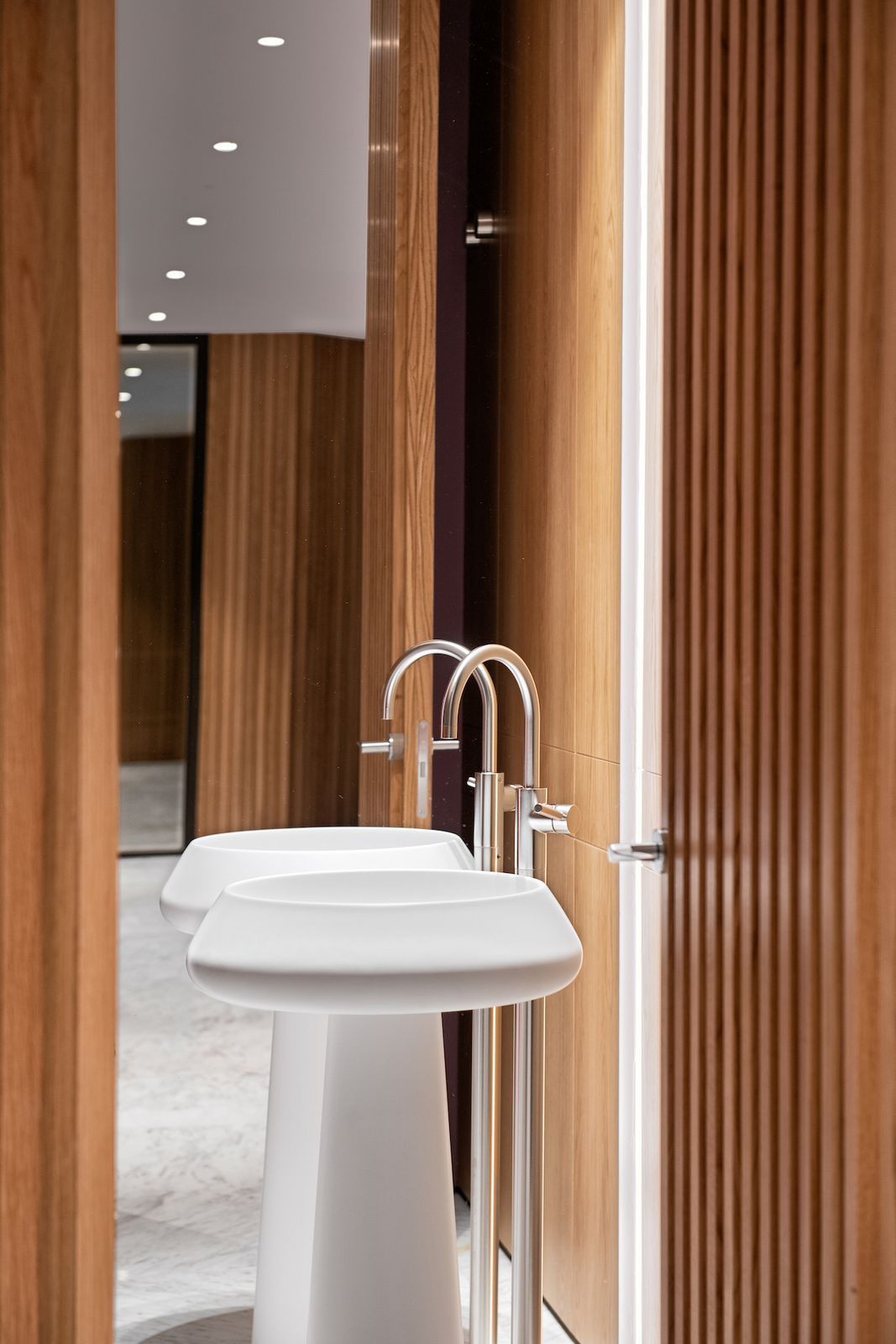 The property is spread over two floors. On the main floor, there is a spacious living-dining area with a fireplace and floor-to-ceiling windows that flood the space with natural light and provide direct access to the terrace and communal areas. The Fendi-designed kitchen is integrated into the living room, creating an open and modern atmosphere. The master bedroom includes a large en-suite bathroom with both a bathtub and shower, as well as large windows that offer plenty of light and access to the terrace. This floor also features a uniquely designed guest bathroom and two spacious bedrooms, each with its own en-suite bathroom.