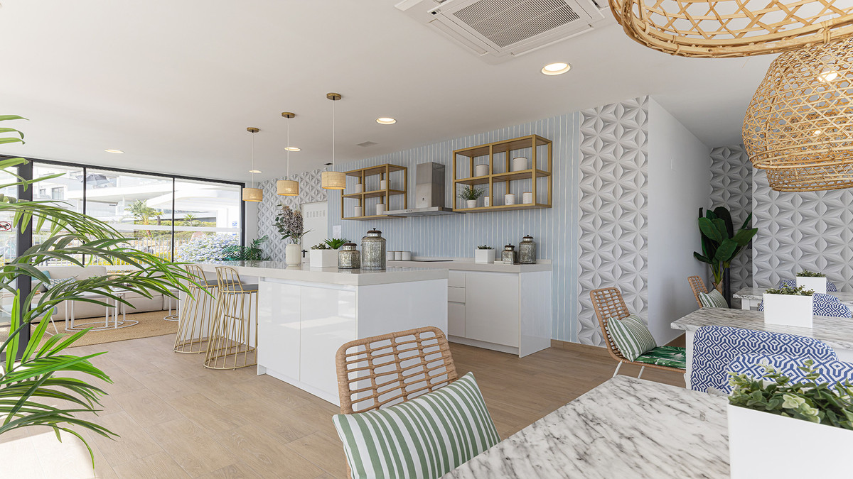 Straight ahead, the open-plan kitchen, dining, and living area is light-filled and modern, seamlessly leading out onto the large terrace, ideal for dining al fresco or enjoying the long, sunny Spanish afternoons while soaking in the stunning sea views.