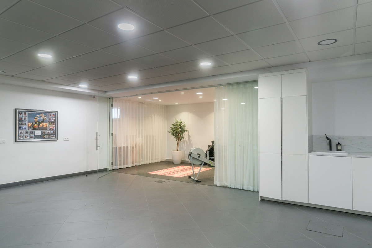 L'intérieur est entièrement meublé et comprend une cuisine équipée, un coin repas et un salon. De grandes baies vitrées laissent entrer la lumière naturelle tout en offrant une vue sur le jardin privé et la piscine. Un ascenseur dessert tous les niveaux, assurant confort et accessibilité, et un garage peut accueillir jusqu'à quatre voitures.