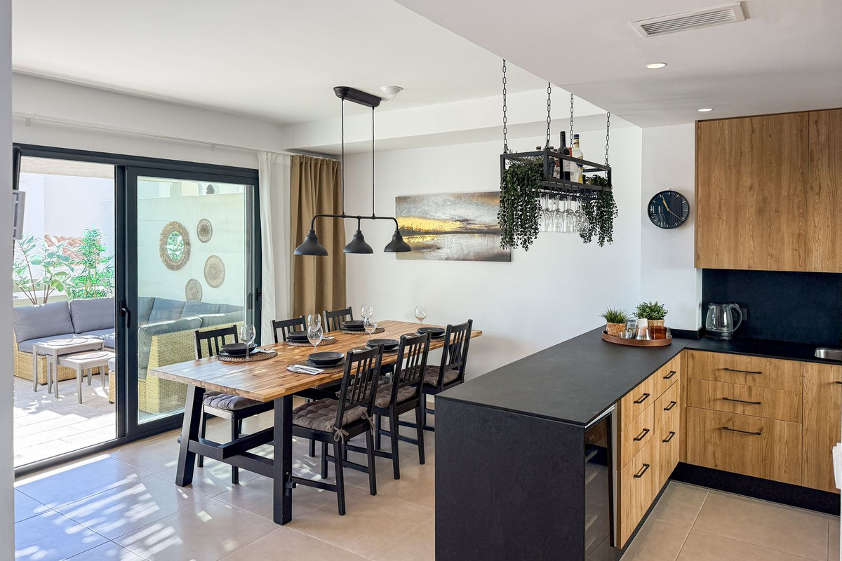 Au rez-de-chaussée se trouvent une cuisine moderne, un salon-salle à manger lumineux, une chambre et une salle de bains. De ce niveau, vous accédez également à deux grandes terrasses de chaque côté de la maison, idéales pour profiter du soleil tout au long de la journée.
