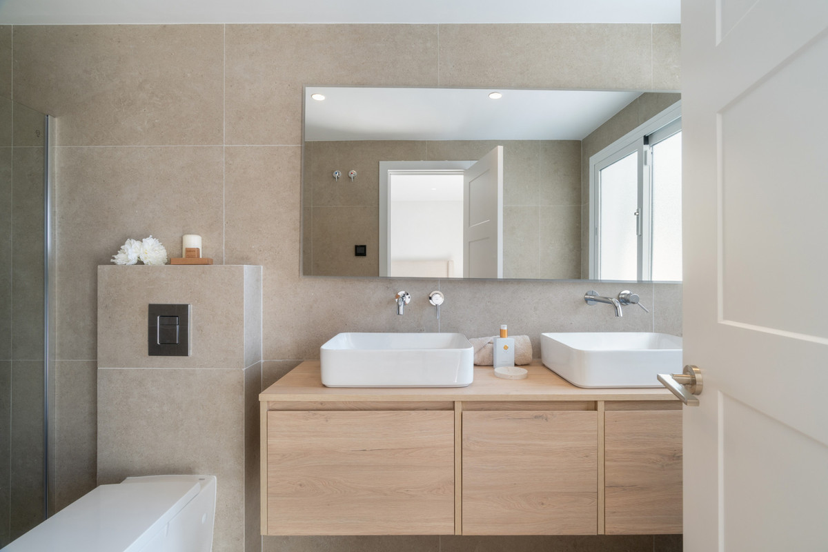 À l'intérieur, le rez-de-chaussée s'étend sur près de 80 m² et comprend une élégante cuisine ouverte, un spacieux séjour, un hall d'entrée et des toilettes invités. L'espace est imprégné des principes de design scandinave, avec des matériaux modernes de haute qualité soigneusement sélectionnés. Sous l'escalier se trouve un cellier sur mesure. Toutes les pièces sont équipées de systèmes Airzone à réglage individuel pour le chauffage et la climatisation, tandis que toutes les salles de bains sont équipées d'un chauffage au sol. Les pièces d'eau sont revêtues d'un carrelage élégant, toute hauteur, dans un ton beige chaleureux.
