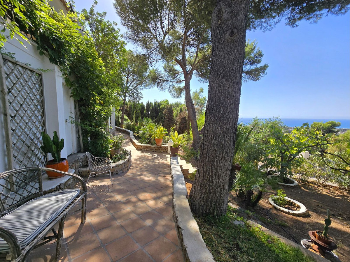 À l'intérieur, un hall d'entrée accueillant aux plafonds en bois mansardés donne le ton à l'élégance de la maison. À gauche, un salon lumineux et aéré, avec cheminée, baigne de lumière, créant une atmosphère chaleureuse et accueillante. La cuisine, pleine de caractère et aux couleurs vibrantes, s'ouvre sur une spectaculaire terrasse suspendue offrant une vue imprenable sur la mer, joliment encadrée par des bougainvilliers et des jacarandas – un endroit idéal pour savourer des repas en plein air ou simplement s'imprégner de l'atmosphère méditerranéenne.