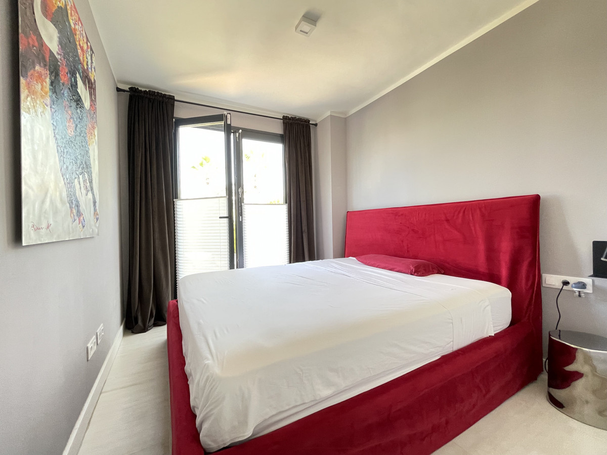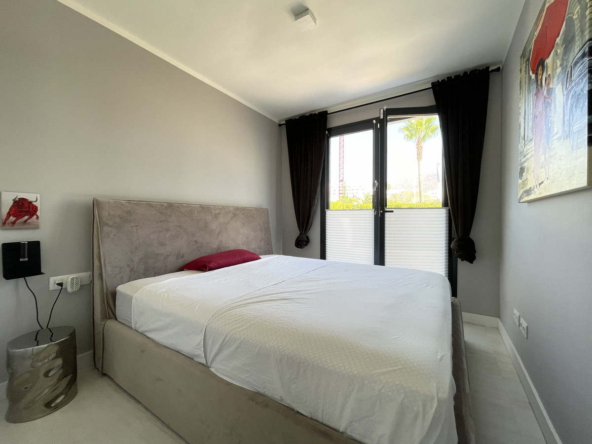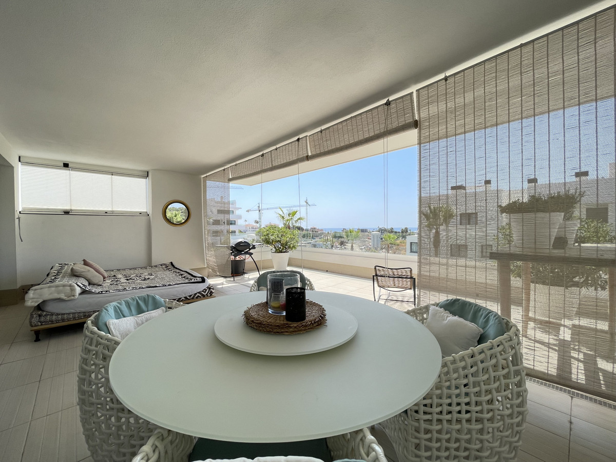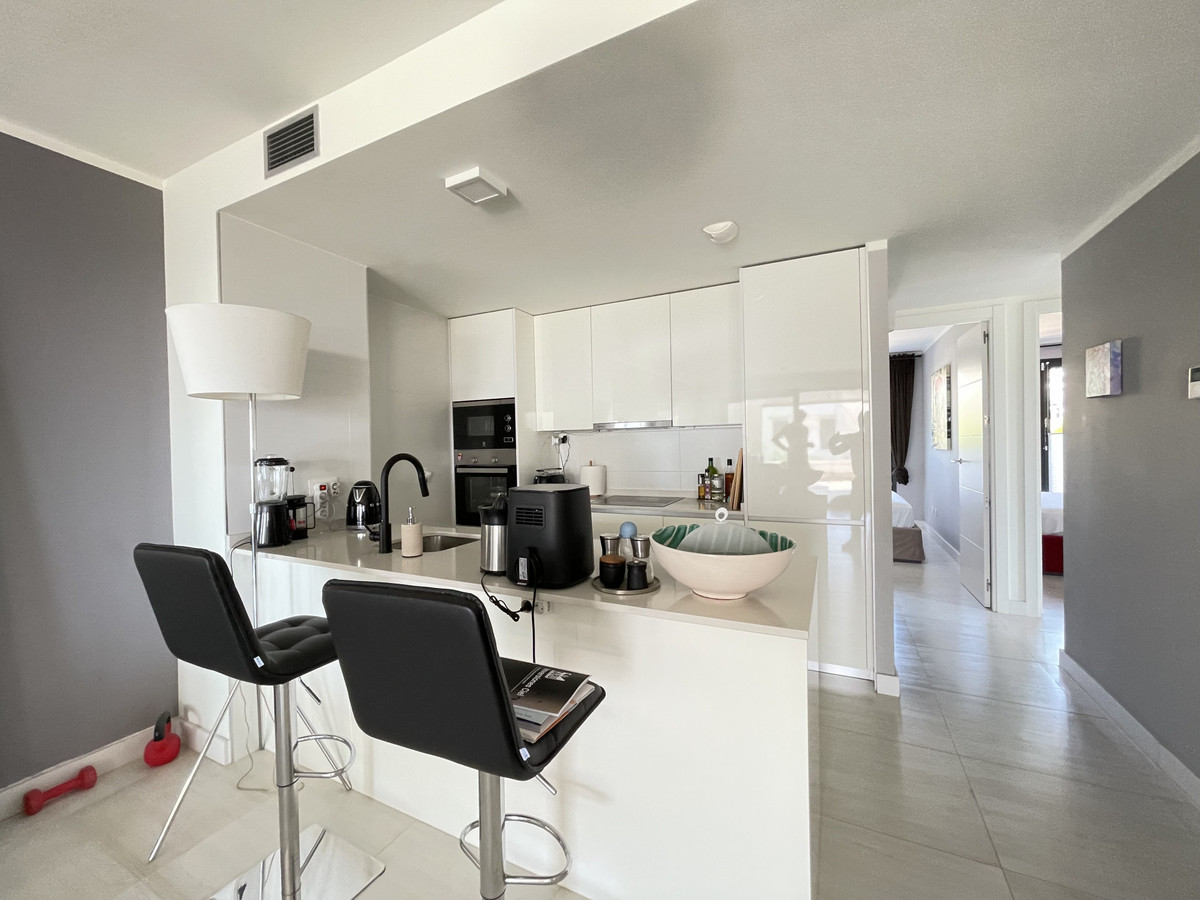 Il dispose de deux chambres et de deux salles de bains, idéal pour les familles et les couples privilégiant l'espace et la fonctionnalité. L'appartement dispose d'une terrasse privée de 45 m² et d'un patio de 45 m² au rez-de-chaussée, parfaits pour profiter du climat méditerranéen, du soleil et d'une vue partielle sur la mer. La propriété dispose d'une cuisine ouverte entièrement équipée, d'une buanderie séparée, de la climatisation et de placards intégrés optimisant l'espace.