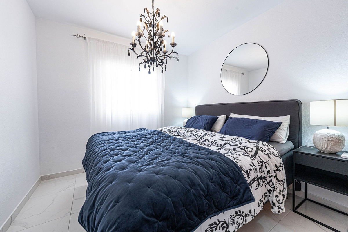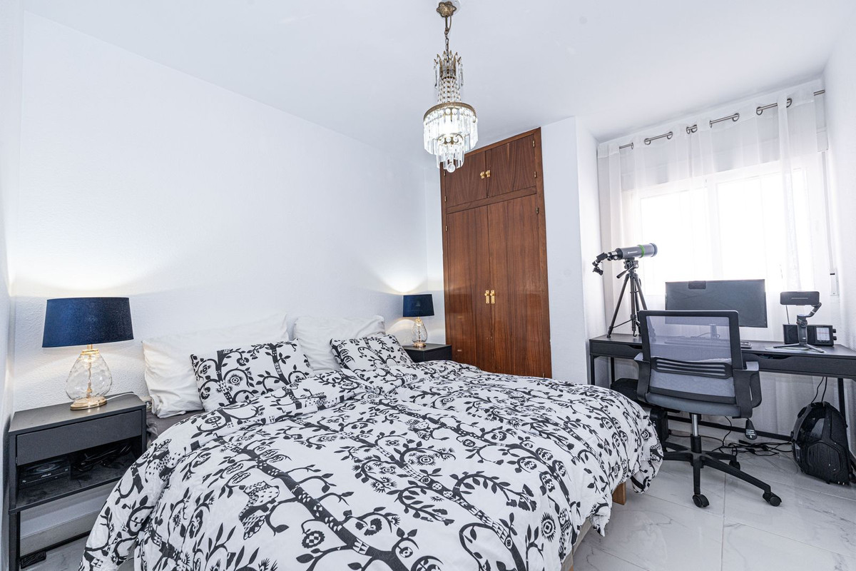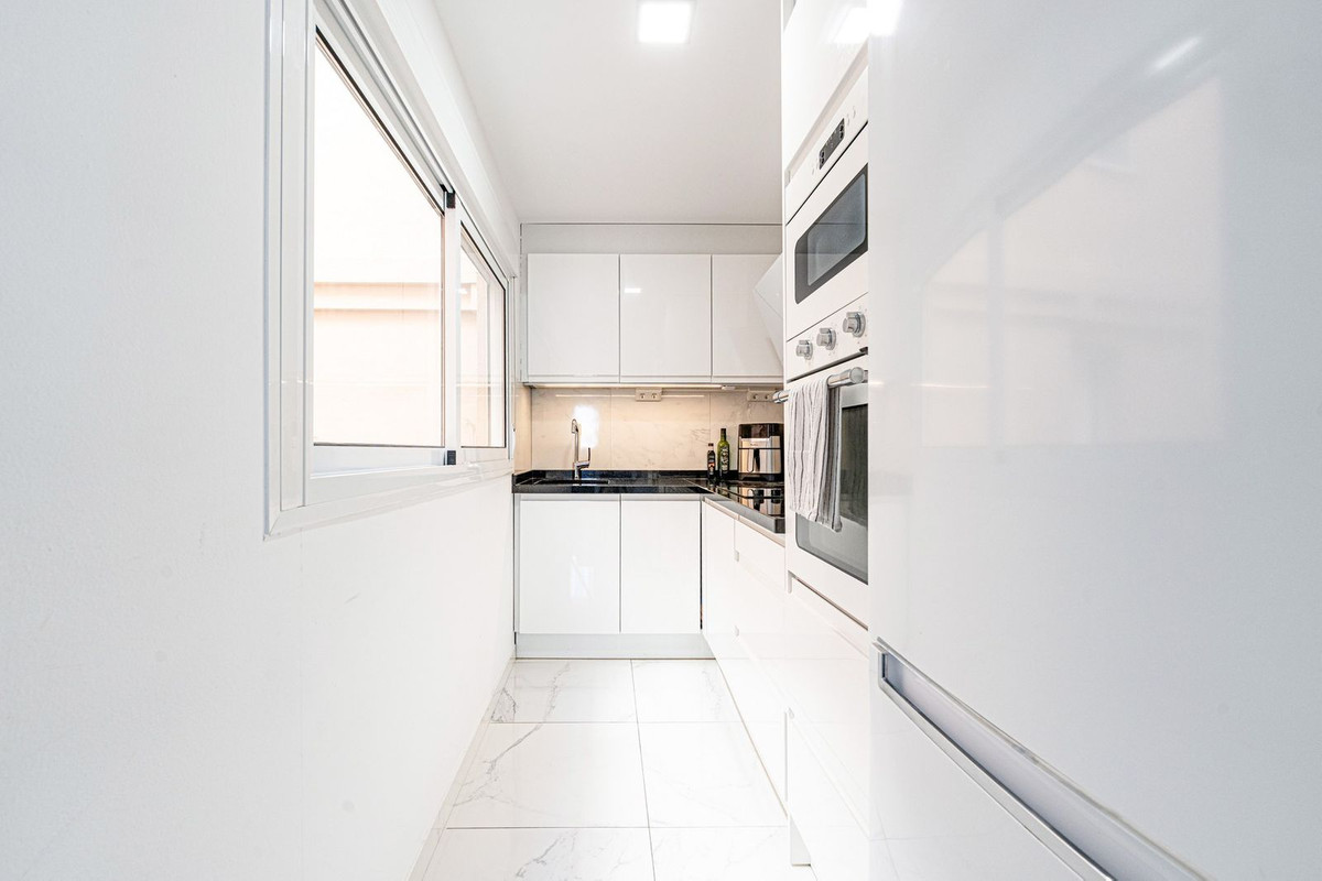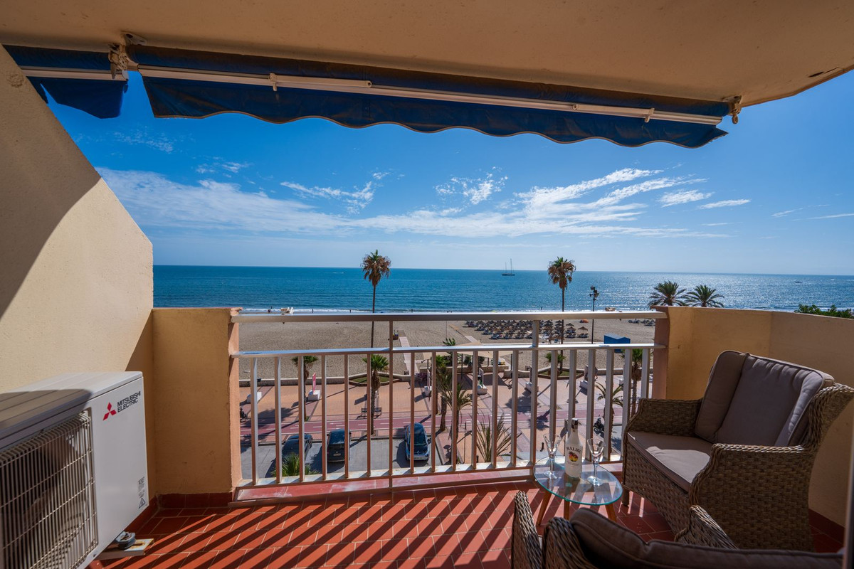 L'appartement, fraîchement rénové, mesure 90 m². La cuisine, entièrement rénovée et équipée, dispose d'électroménagers encastrés neufs de haute qualité et de plans de travail en pierre. Le salon spacieux et lumineux peut accueillir une table à manger. Il donne également accès à une grande terrasse donnant directement sur la mer. Les deux chambres spacieuses et paisibles disposent de placards intégrés et offrent une vue sur les montagnes de Mijas. L'élégante salle de bains a également été récemment rénovée.