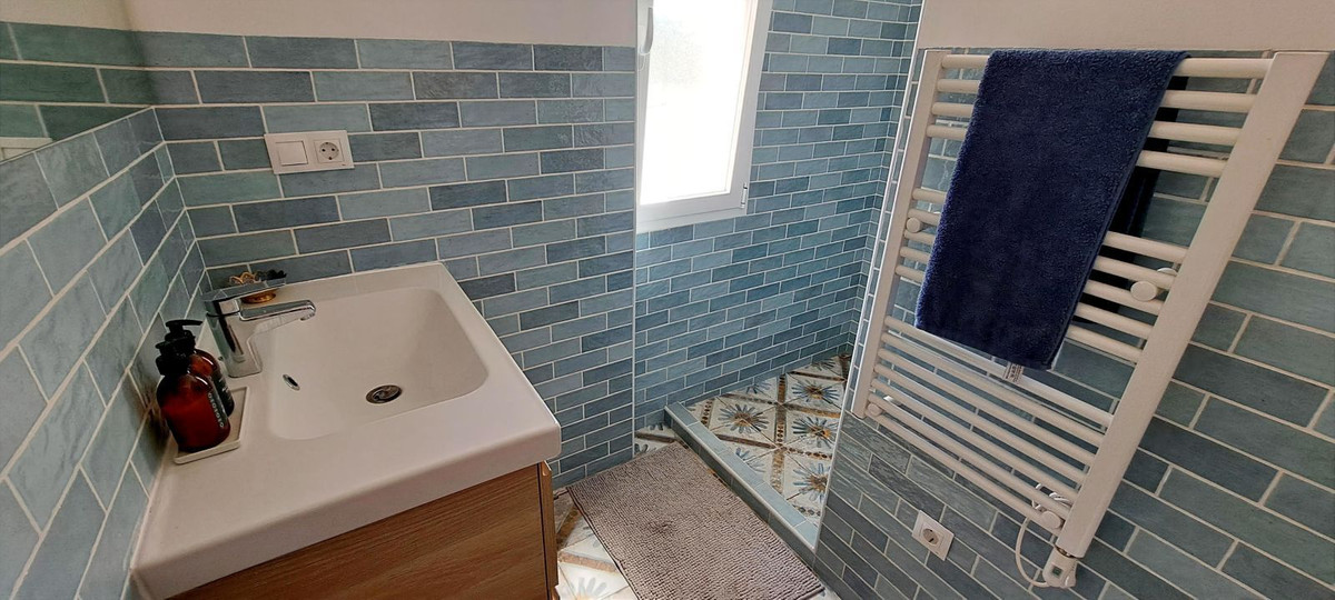 On the other side of the house, we enter the bedroom area. The first two bedrooms are spacious and equipped with modern air conditioning. These two bedrooms share a modern bathroom with a sink and spacious walk-in shower in the middle. The toilet is located in a separate room, equipped with a sliding door to make optimal use of the available space.