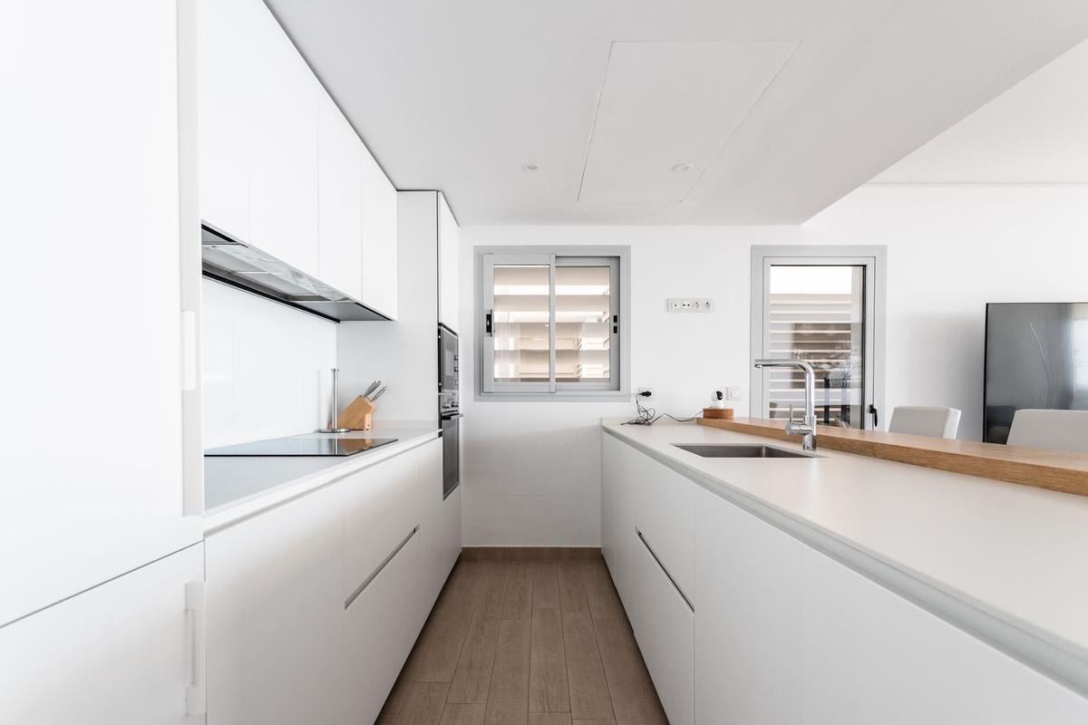 The home boasts modern style and consists of three bedrooms, two bathrooms, one of which is en-suite, open kitchen and living room. Out through the sliding glass doors we find a south-facing terrace of 21 sqm with a fantastic view of Fuengirola and the mediterranean Sea. Included are two parking spaces in the garage and a generous storage room.