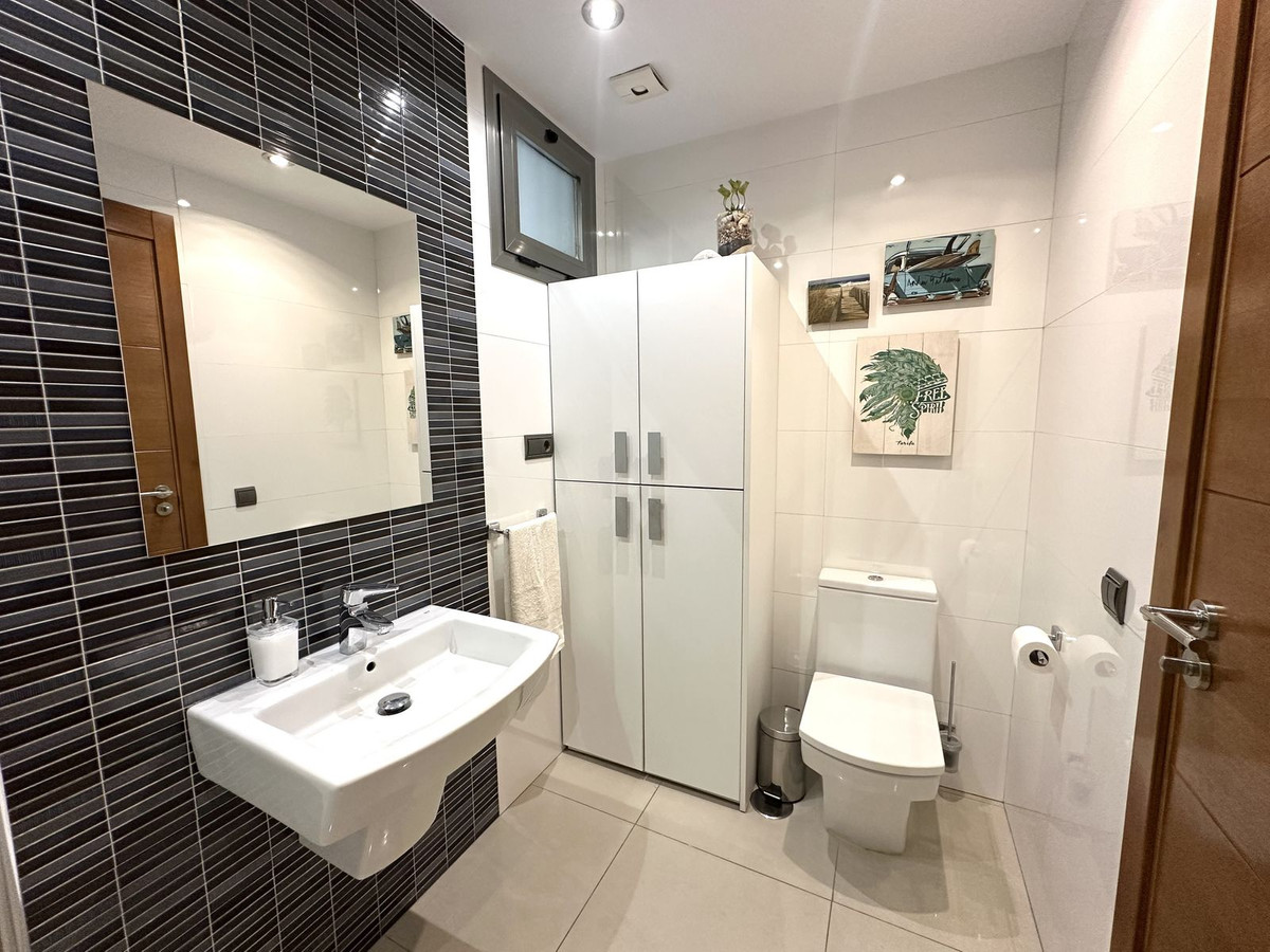 Depuis la terrasse, vous accédez directement à l'une des chambres bien agencées, créant une agréable connexion entre les espaces intérieurs et extérieurs. À côté de cette pièce se trouve la deuxième chambre. Ces deux pièces partagent une salle de bain avec douche. La spacieuse chambre principale dispose de sa propre salle de bain privative avec baignoire et climatisation. Les trois chambres disposent de placards intégrés et bénéficient de la lumière naturelle.