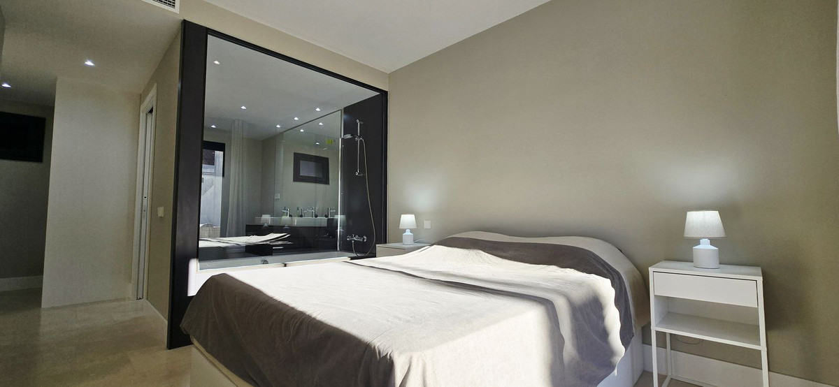 La terrasse s'étend sur deux niveaux : le niveau inférieur dispose d'un jacuzzi privé, idéal pour se détendre en toute intimité. Les deux chambres bénéficient d'un accès direct à la terrasse, baignant les pièces de lumière naturelle. La chambre d'amis est équipée de placards, tandis que la suite parentale dispose d'un dressing et d'une spacieuse salle de bains attenante avec double vasque et baignoire. Une salle de bains moderne avec douche à l'italienne complète ce bien.