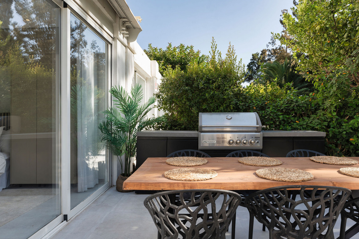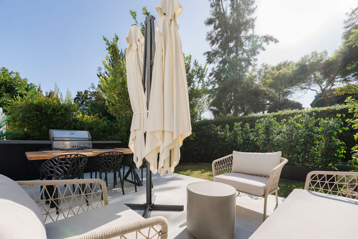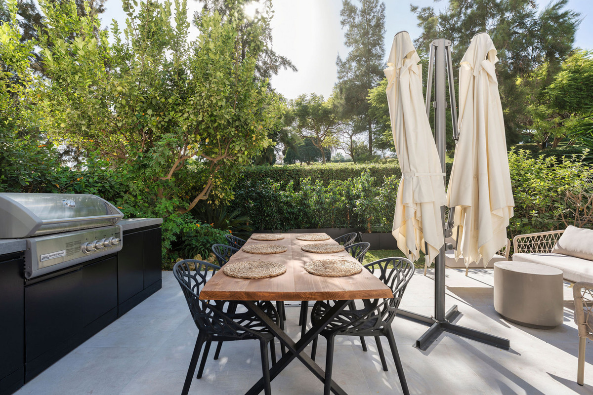 La terrasse prolonge l'espace de vie extérieur, créant une transition naturelle idéale pour la détente et les réceptions. Doté d'espaces dédiés au salon et aux repas, avec notamment un barbecue intégré, cet espace invite aux repas en plein air, avec une vue imprenable sur le coucher de soleil et le cadre paisible du golf. La cuisine, équipée d'électroménagers Siemens, est élégante et minimaliste, conçue pour maximiser l'efficacité sans compromettre l'esthétique.