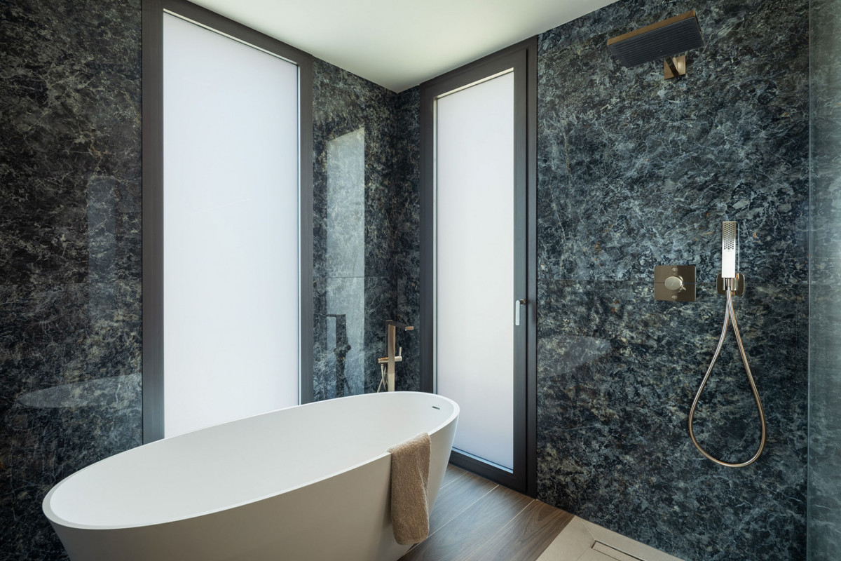 Chaque recoin de la maison présente des finitions haut de gamme et des détails sophistiqués. La cuisine et la menuiserie design Modulnova sont omniprésentes, tandis que les grandes fenêtres en aluminium Schüco (2 300 mm et 2 500 mm) baignent l'intérieur de lumière naturelle. La porte d'entrée principale pivotante Schüco, éclairée par LED, signe une architecture audacieuse.