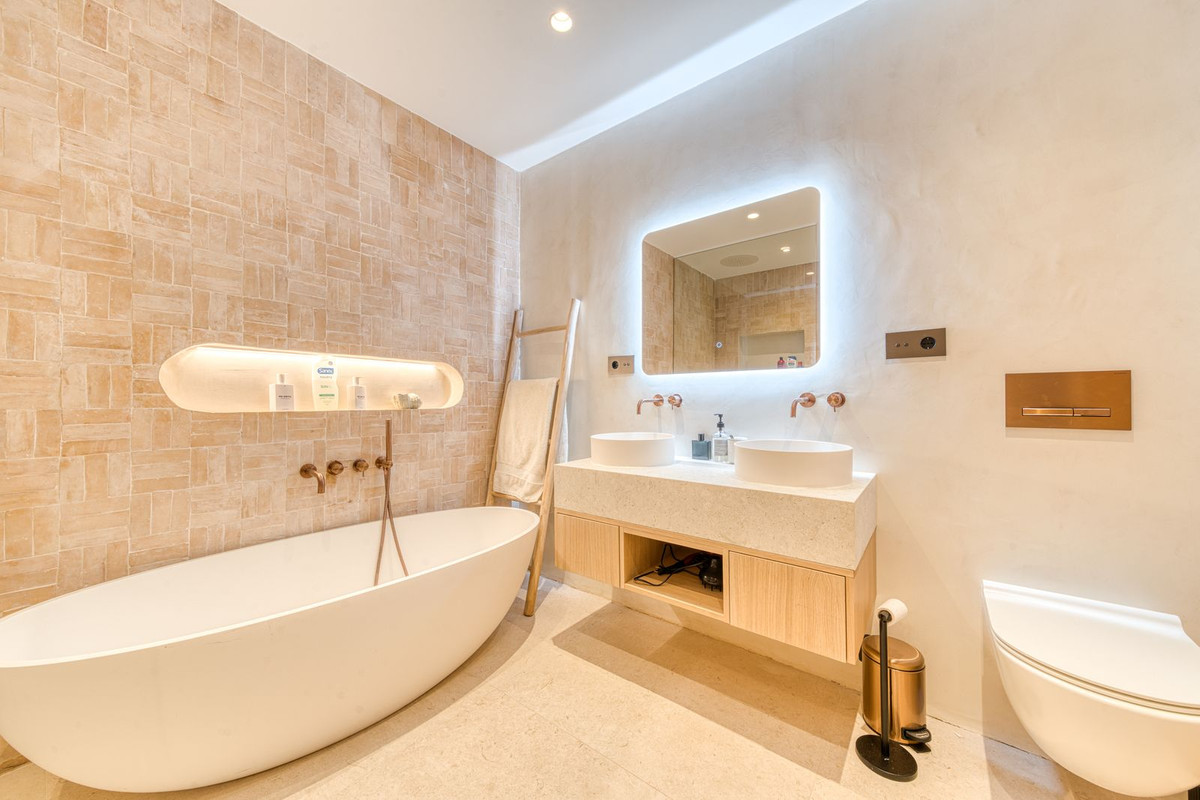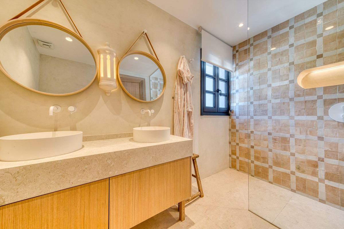 On accède à cette superbe demeure par une cour baignée de soleil, idéale pour les repas en plein air, et l'on découvre un intérieur où chaque détail a été soigneusement pensé. Le rez-de-chaussée, à la circulation fluide, abrite une cuisine design équipée d'appareils Gaggenau, un îlot central et une salle à manger spacieuse. Le salon ouvert est mis en valeur par des poutres apparentes en chêne blanchi et de larges baies vitrées coulissantes donnant sur une vaste terrasse, inondant l'espace de lumière et créant une harmonie parfaite entre intérieur et extérieur. Au niveau inférieur, le confort et les loisirs sont à l'honneur : un salon cinéma privé avec un canapé d'angle, une cuisine et un bar, une cave à vin et deux suites d'invités élégamment aménagées, chacune avec sa propre salle de bains et un accès à une terrasse couverte. À l'étage, la suite parentale offre un havre de paix avec un dressing, une salle de bains privative complète et une magnifique baignoire îlot. Une quatrième chambre complète ce niveau, idéale pour la famille ou des invités supplémentaires.