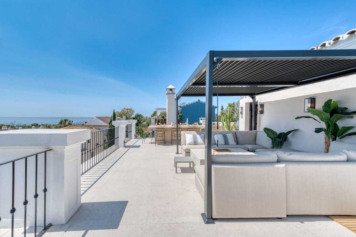La terrasse sur le toit est tout simplement époustouflante, offrant une vue panoramique imprenable qui s'étend de La Concha aux toits du Puente Romano, en passant par la mer Méditerranée, et même Gibraltar et l'Afrique du Nord par temps clair. Conçue pour être habitée toute l'année, elle comprend un bassin chauffé, un espace barbecue et repas, ainsi qu'un salon ombragé pour se détendre, incarnant à merveille le style de vie marbellien, entre intérieur et extérieur. La propriété est proposée non meublée, mais le vendeur acceptera une offre incluant le mobilier dans la vente.