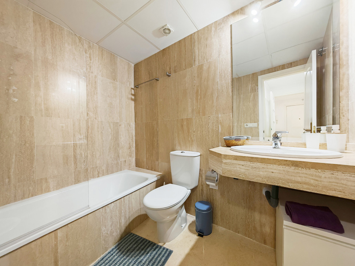 Appartement à vendre à Elviria, Marbella, comprenant 2 chambres, 2 salles de bains (dont une attenante), une orientation sud-ouest, une piscine commune, un garage commun (1 place de parking) et un jardin commun. D'une superficie de 123 m² habitables et 16,25 m² de terrasse, il bénéficie des équipements suivants à proximité : climatisation, entièrement meublé, cuisine équipée, sols en marbre, terrasse privative, réservoir d'eau, vue sur la campagne, piscine intérieure, buanderie, Wi-Fi, terrasse couverte, placards intégrés, résidence sécurisée, ascenseur, accès facile à la mer/plage, golf, balcon, système de refroidissement au plafond, proximité du centre-ville, des écoles, caméras de surveillance, au sein d'un complexe golfique et à proximité des restaurants.