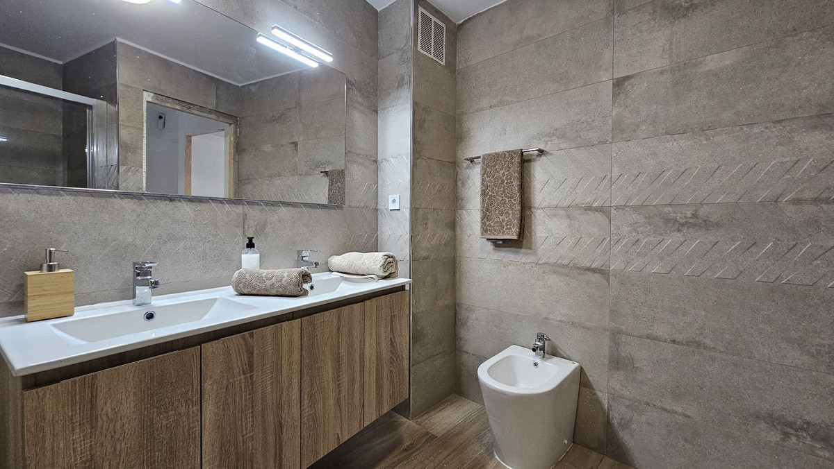 Une autre salle de bain entièrement équipée se trouve dans le couloir, partagée par les deux autres chambres. L'une peut accueillir un lit double et dispose de placards intégrés, tandis que l'autre, plus petite, peut être aménagée en chambre avec un lit simple ou en bureau/espace de rangement.