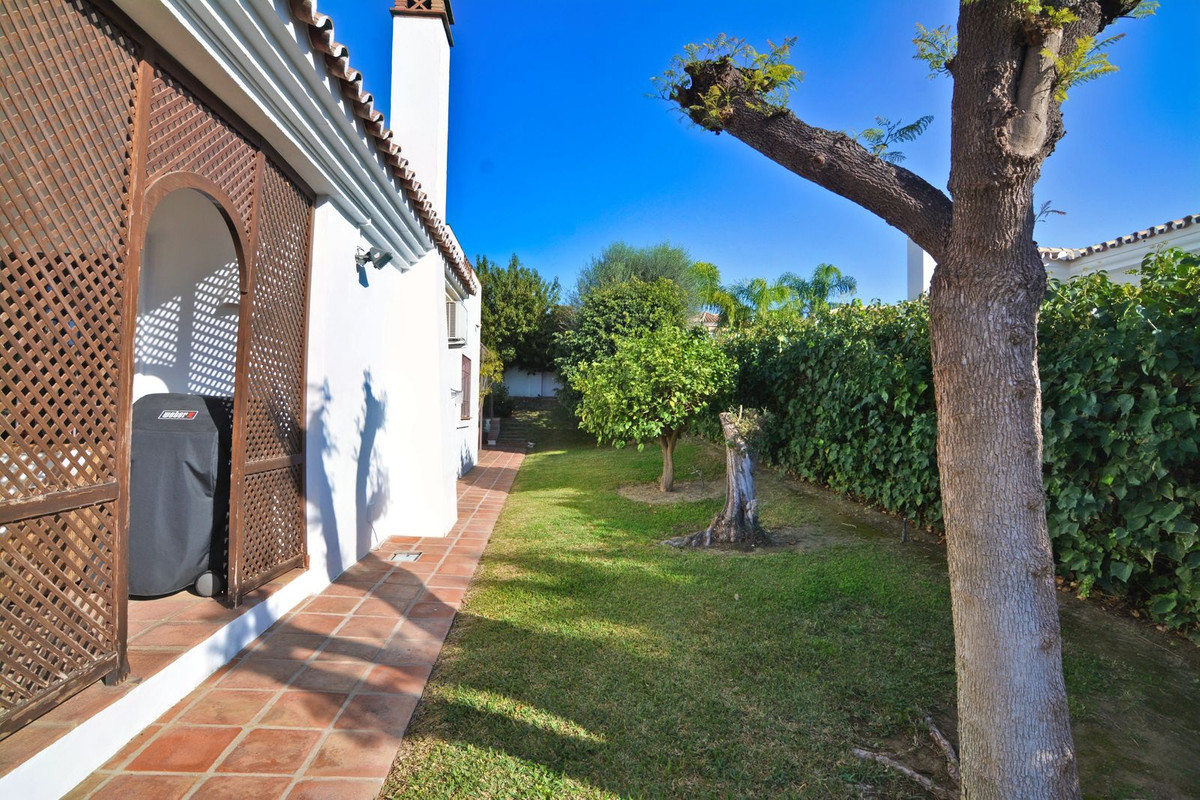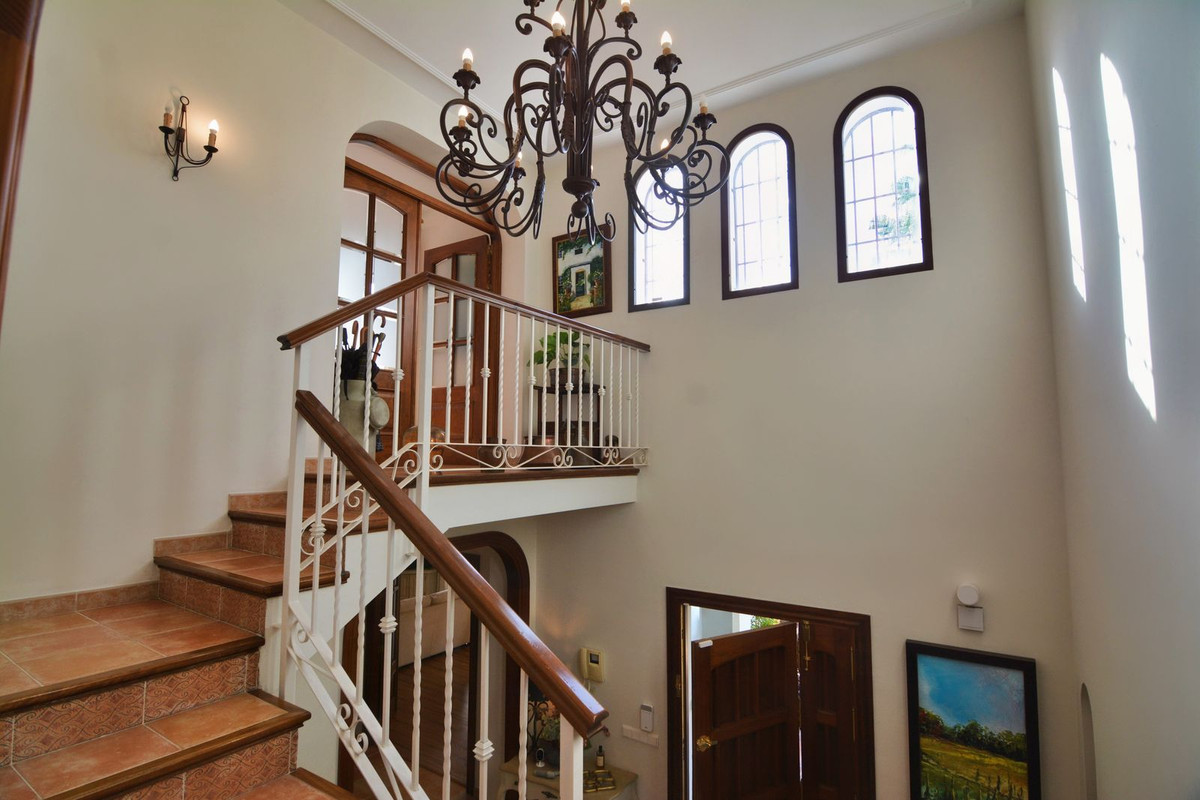 La propriété se situe sur un terrain de 858 m² avec un jardin arboré et une piscine privée, idéal pour profiter du climat ensoleillé de la Costa del Sol. Au rez-de-chaussée, un séjour spacieux et lumineux, donnant directement sur une véranda couverte, invite à la détente et aux moments conviviaux en plein air. La cuisine indépendante, grande et fonctionnelle, s'ouvre sur une charmante terrasse arrière, parfaite pour les petits-déjeuners ensoleillés. Ce niveau comprend également des toilettes invités.