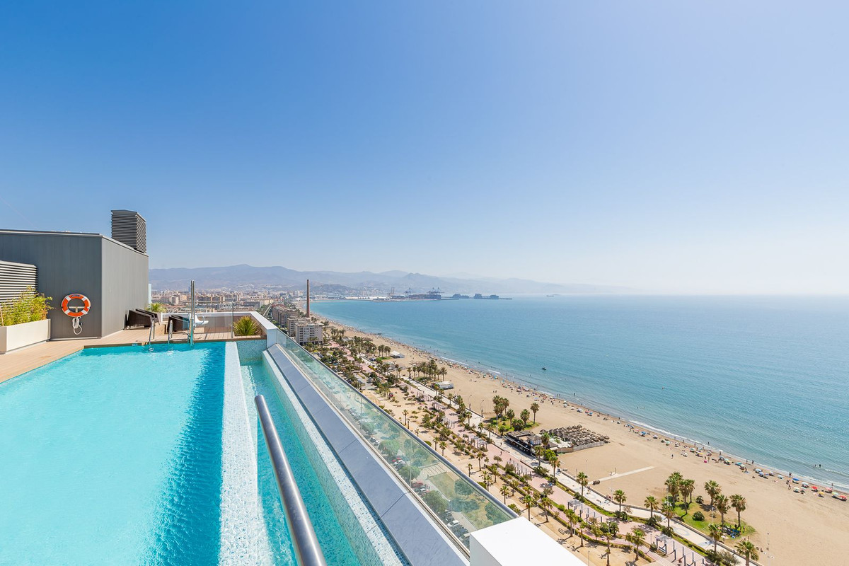 au port de Malaga. Le logement comprend une suite parentale avec vue sur mer, une deuxième chambre avec vue sur mer et salle de bains privative, ainsi que deux autres chambres partageant une salle de bains familiale. Parmi ses atouts majeurs figurent le système domotique ABB Freehome, la climatisation Daikin, le chauffage au sol et les stores Bandalux.
