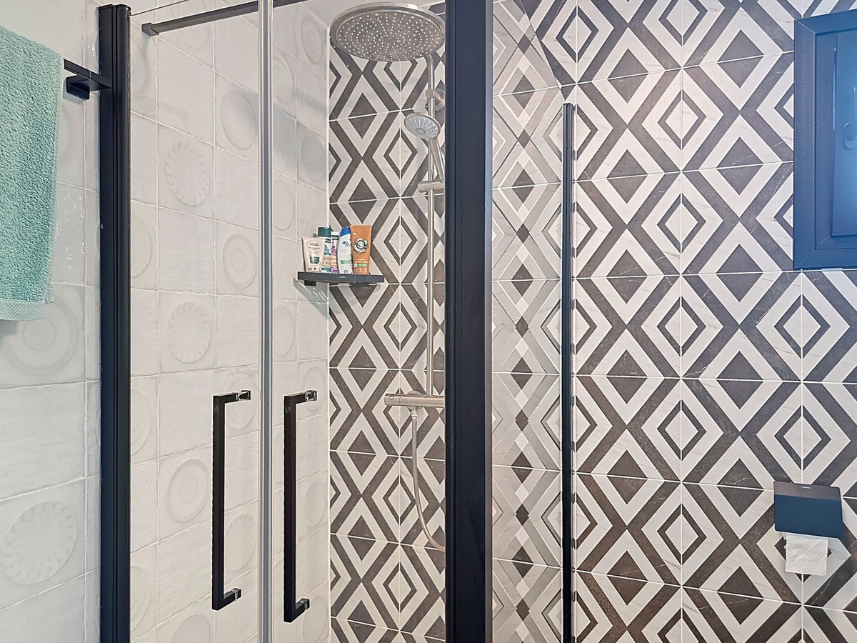 Au rez-de-chaussée, la lumière naturelle inonde le séjour et sa cuisine ouverte, entièrement équipée et conçue avec un souci du détail. De là, on accède à un salon cosy et à une charmante terrasse andalouse, idéale pour un petit-déjeuner au soleil ou un dîner tranquille en plein air. On y trouve également une salle de bains avec douche, un débarras et une chambre pouvant servir de bureau ou d'espace multifonctionnel.