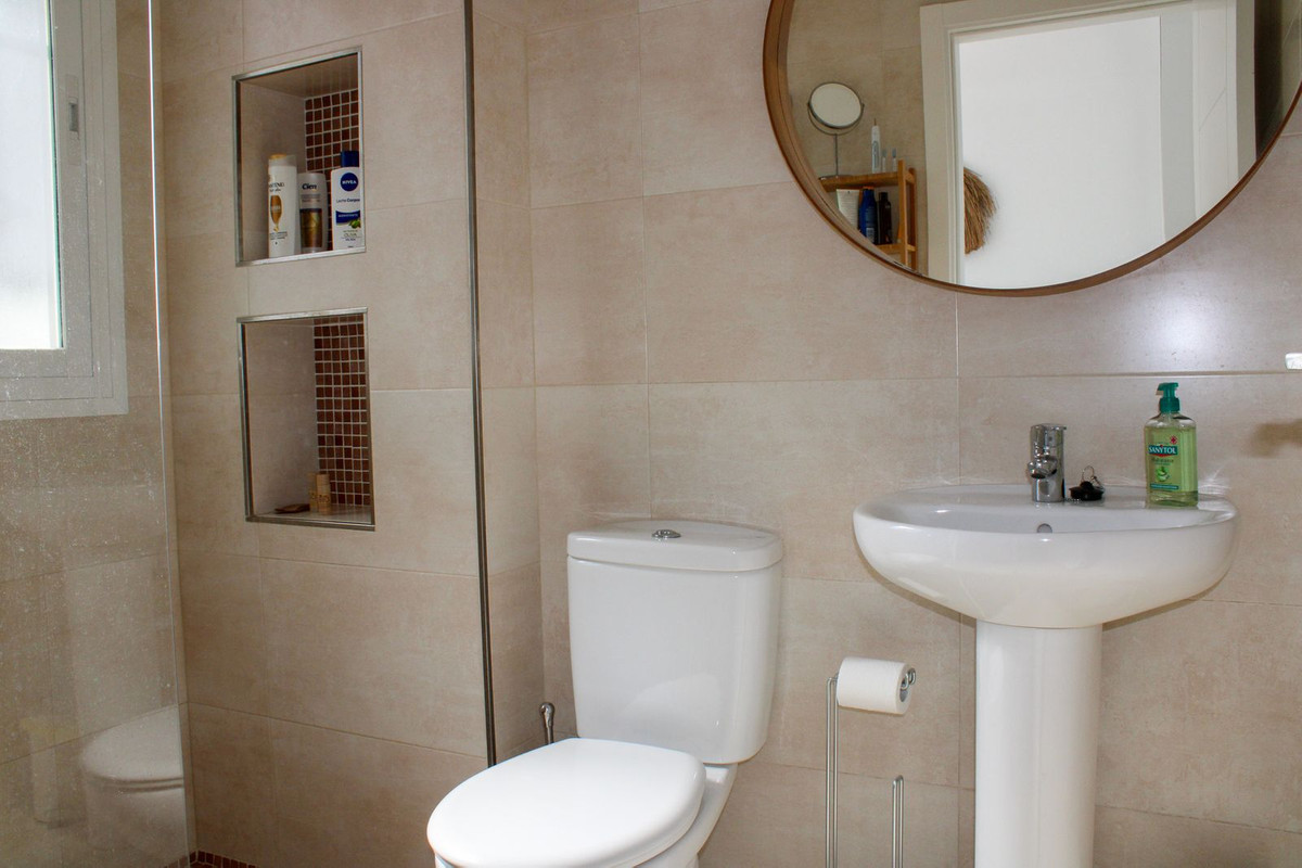 Nous continuons à gauche à l'entrée et nous trouvons d'abord une salle de bains, puis une chambre. Vient ensuite une autre chambre, celle-ci avec sa propre salle de bains. De cette chambre, on accède également à une charmante terrasse ; imaginez-vous vous réveiller face à cette vue magnifique. Enfin, nous montons sur le toit-terrasse, l'endroit idéal pour profiter pleinement de la vie.