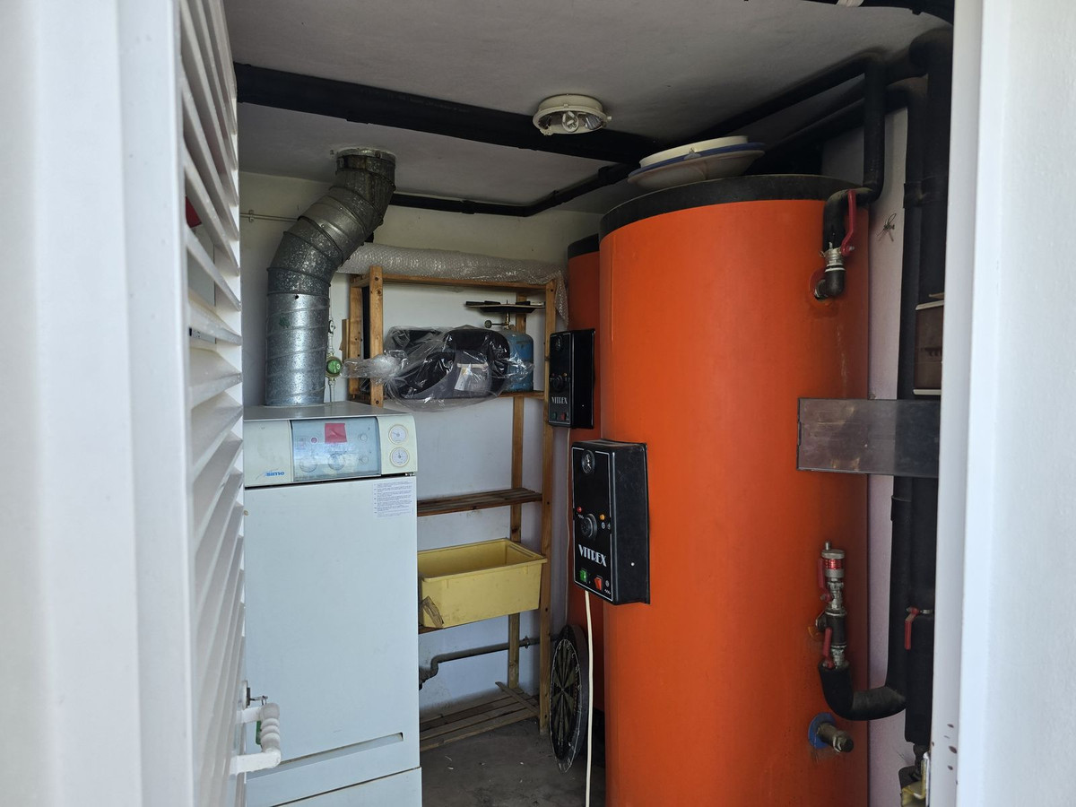 La propriété se compose de deux villas individuelles, chacune avec son propre caractère et son charme. La villa principale présente des éléments rustiques tels que des poutres apparentes et de grandes fenêtres qui inondent de lumière naturelle le spacieux séjour. À l'étage, on trouve une salle à manger ouverte sur une cuisine bien équipée et deux chambres confortables, chacune avec sa propre salle de bains. L'une des chambres donne directement sur le jardin, et une terrasse couverte, accessible depuis la salle à manger, offre une vue imprenable sur la piscine et la verdure environnante.