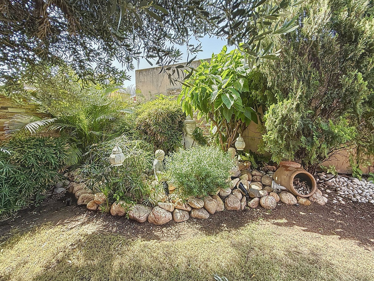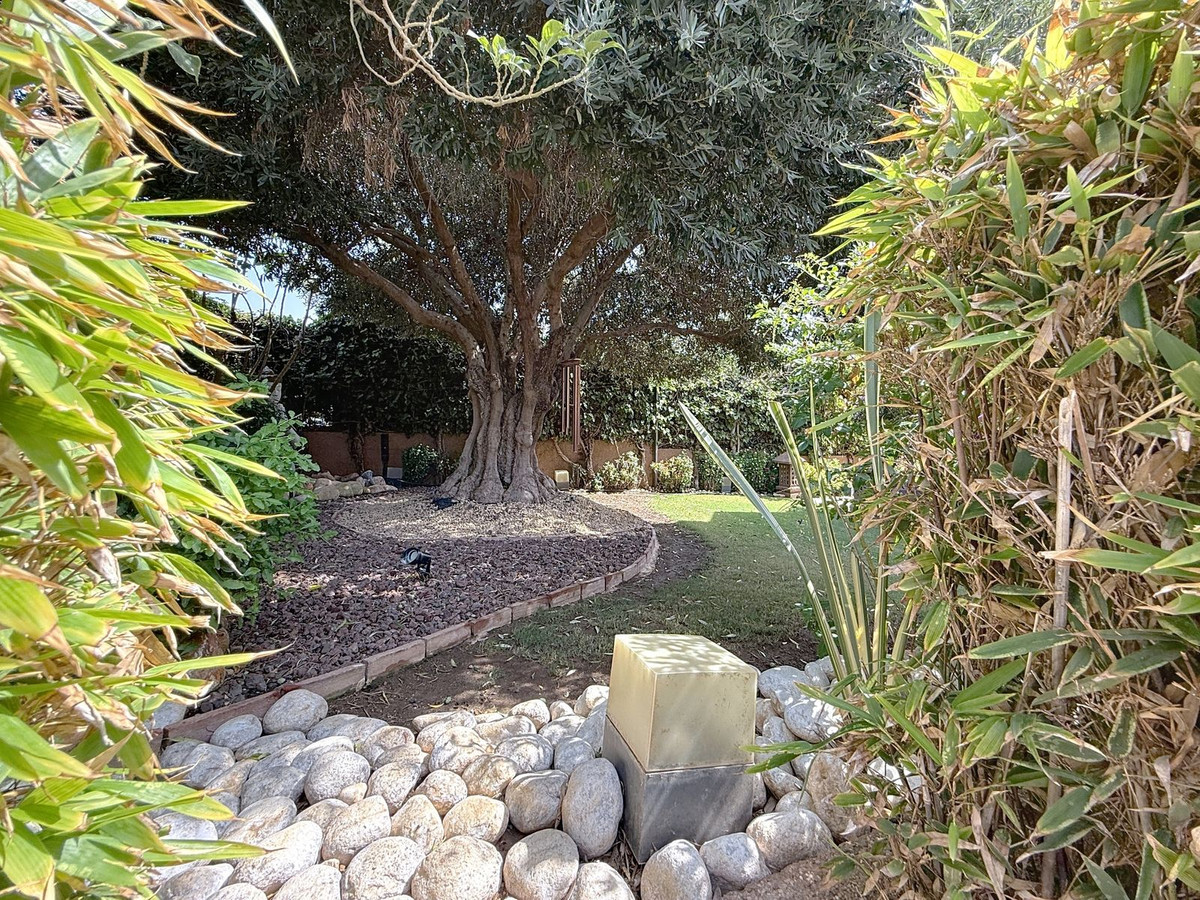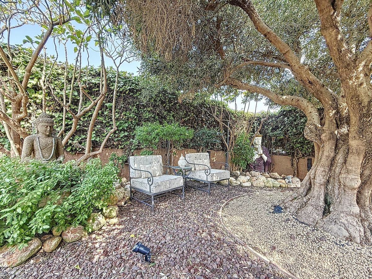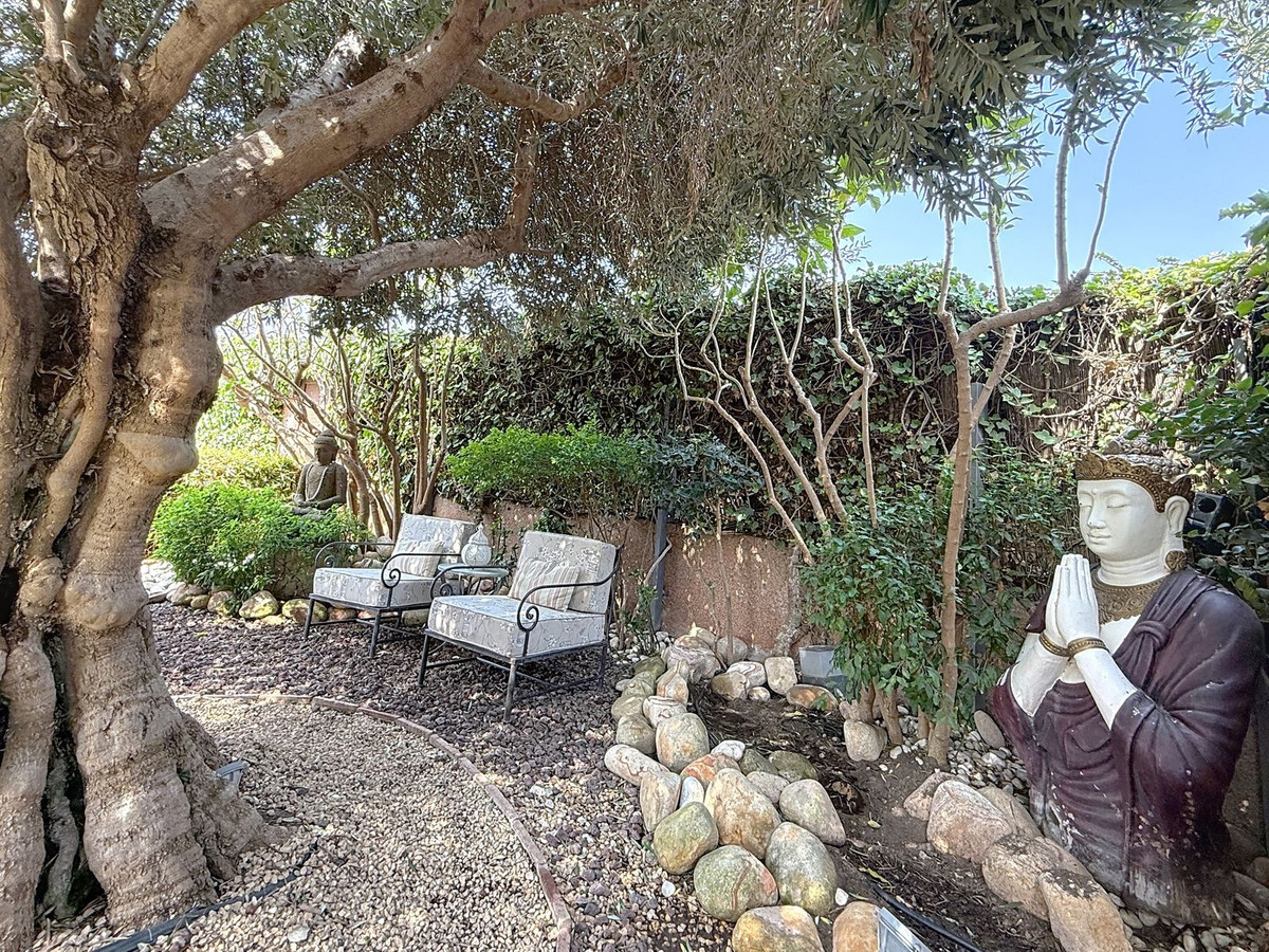 Dès que vous franchissez le portail privé, une sérénité absolue vous enveloppe. Les jardins forment un univers à part : un olivier centenaire veille sur la propriété, des statues de Bouddha invitent à la quiétude, des terrasses ombragées et des coins lounge intimes invitent à la détente. Au cœur de ce havre de paix se trouve une piscine de 6 x 4 m avec jacuzzi, nichée au cœur d'une végétation luxuriante et à l'ombre bienfaisante d'arbres matures – une oasis rare dans ce lieu privilégié.