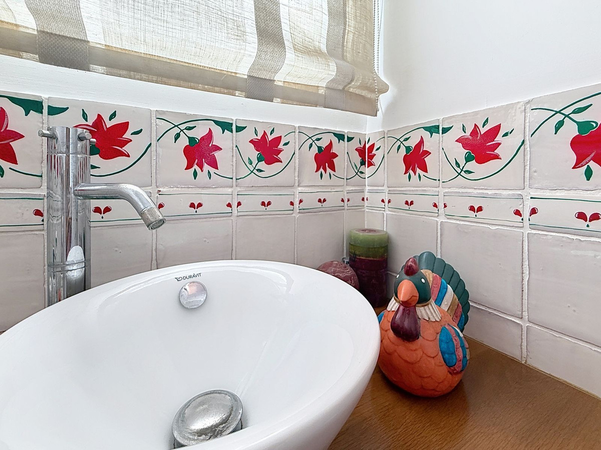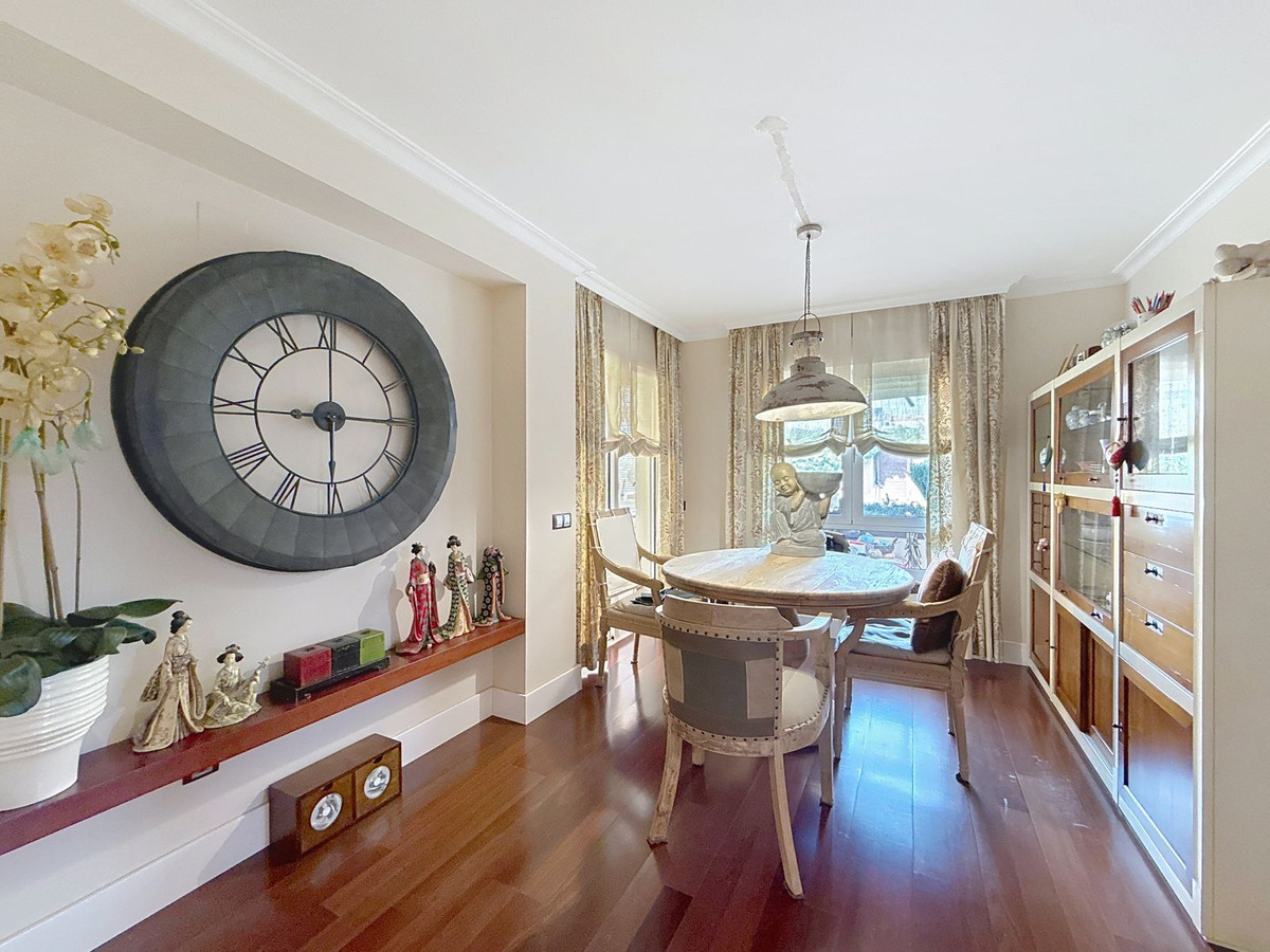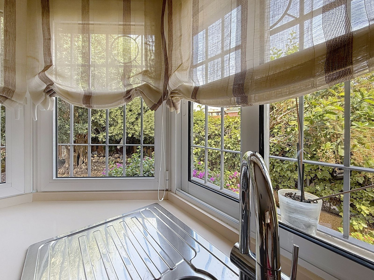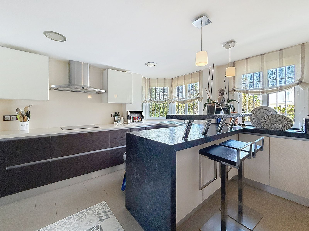 La villa vous accueille avec un hall d'entrée lumineux et des toilettes séparées, avant de dévoiler d'élégants espaces de vie baignés de lumière naturelle. Le salon et la salle à manger, avec leur cheminée chaleureuse et leurs gracieuses fenêtres cintrées, offrent une vue imprenable sur les magnifiques jardins. La cuisine moderne, dotée d'un sol en céramique imitation bois, allie style contemporain et grande facilité d'entretien.