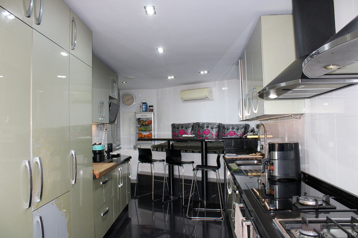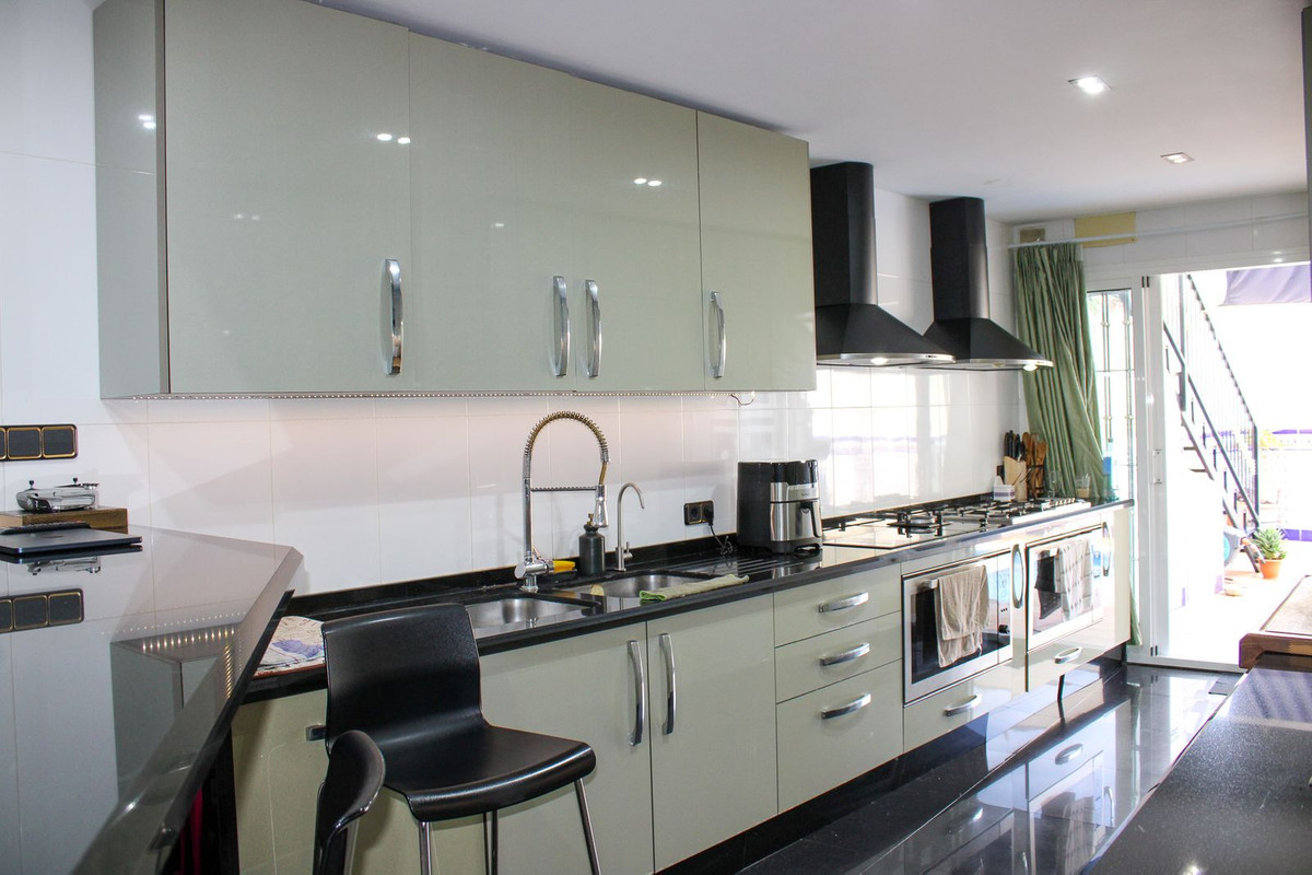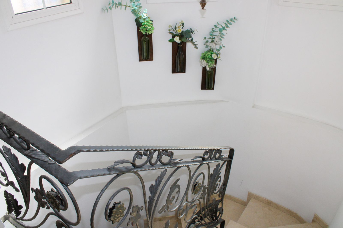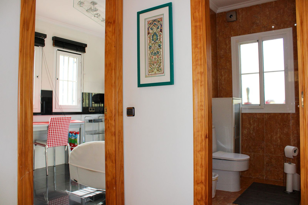 On descend l'escalier à la magnifique rampe en fer forgé qui mène à trois chambres et deux salles de bains. L'une des chambres dispose d'une salle de bains privative et donne également accès à la grande terrasse avec piscine privée, véritable lieu de rencontre de la maison. On y trouve aussi une cuisine moderne entièrement équipée, ainsi qu'un lave-linge et un sèche-linge. La terrasse est également accessible depuis le parking privé, situé à l'entrée de la maison.