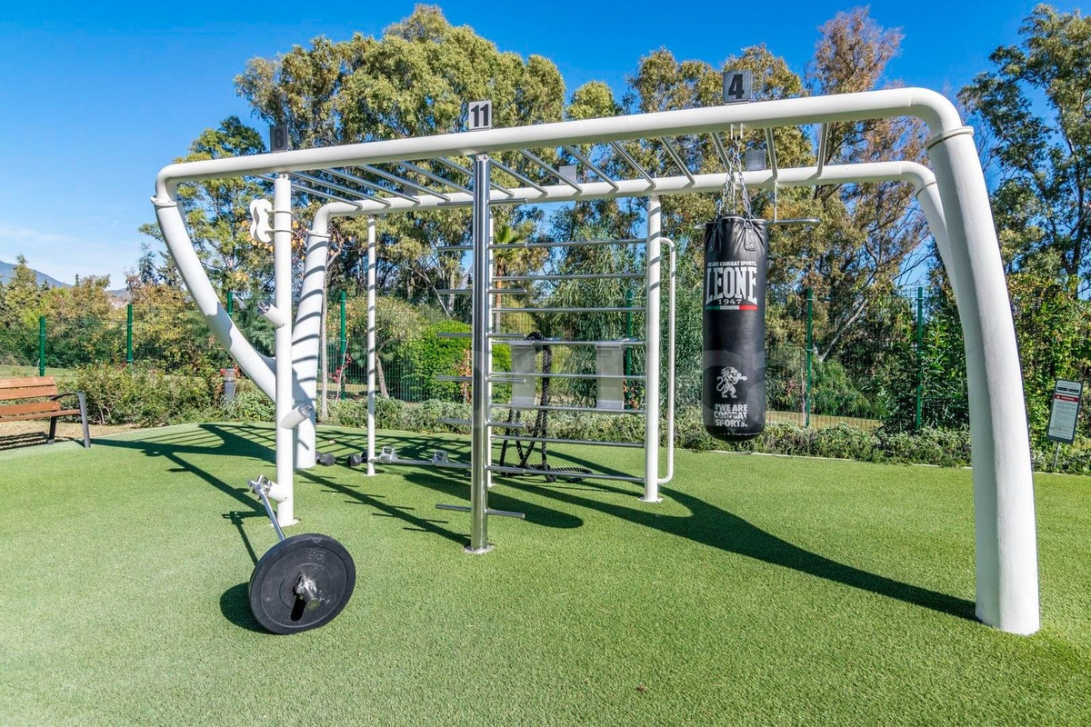 The community offers landscaped gardens, a communal swimming pool, paddle tennis court, barbecue area, outdoor gym, controlled access and video surveillance.