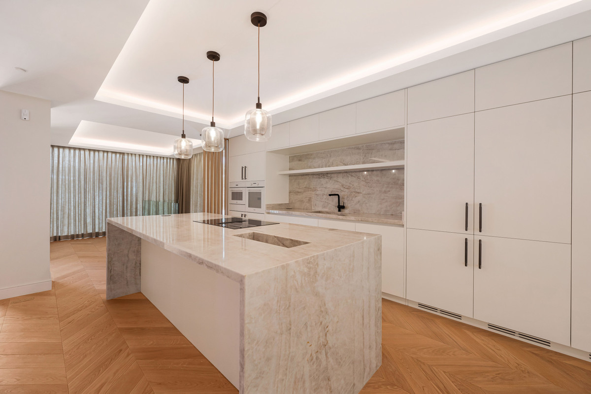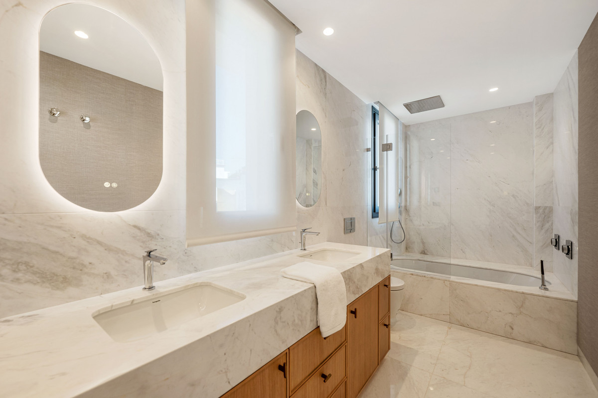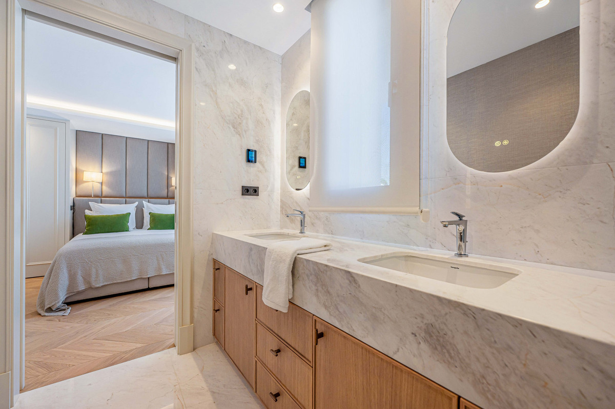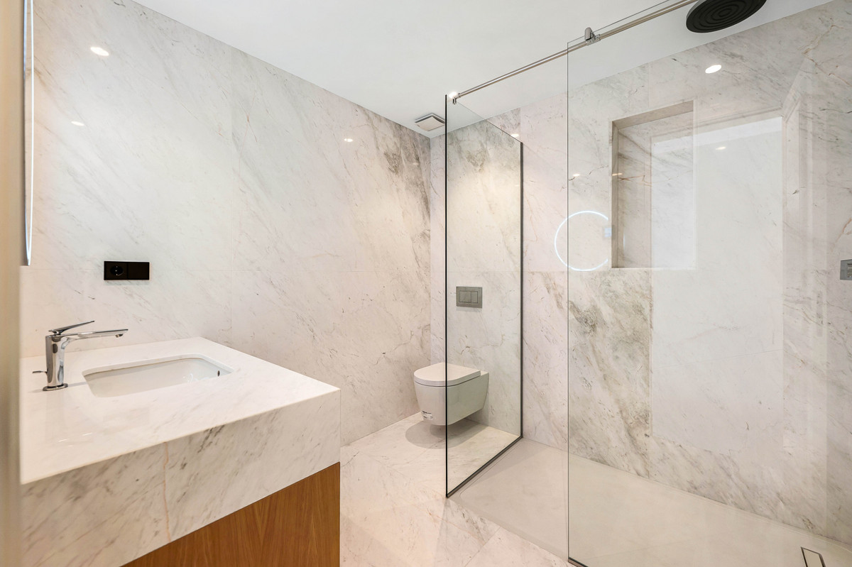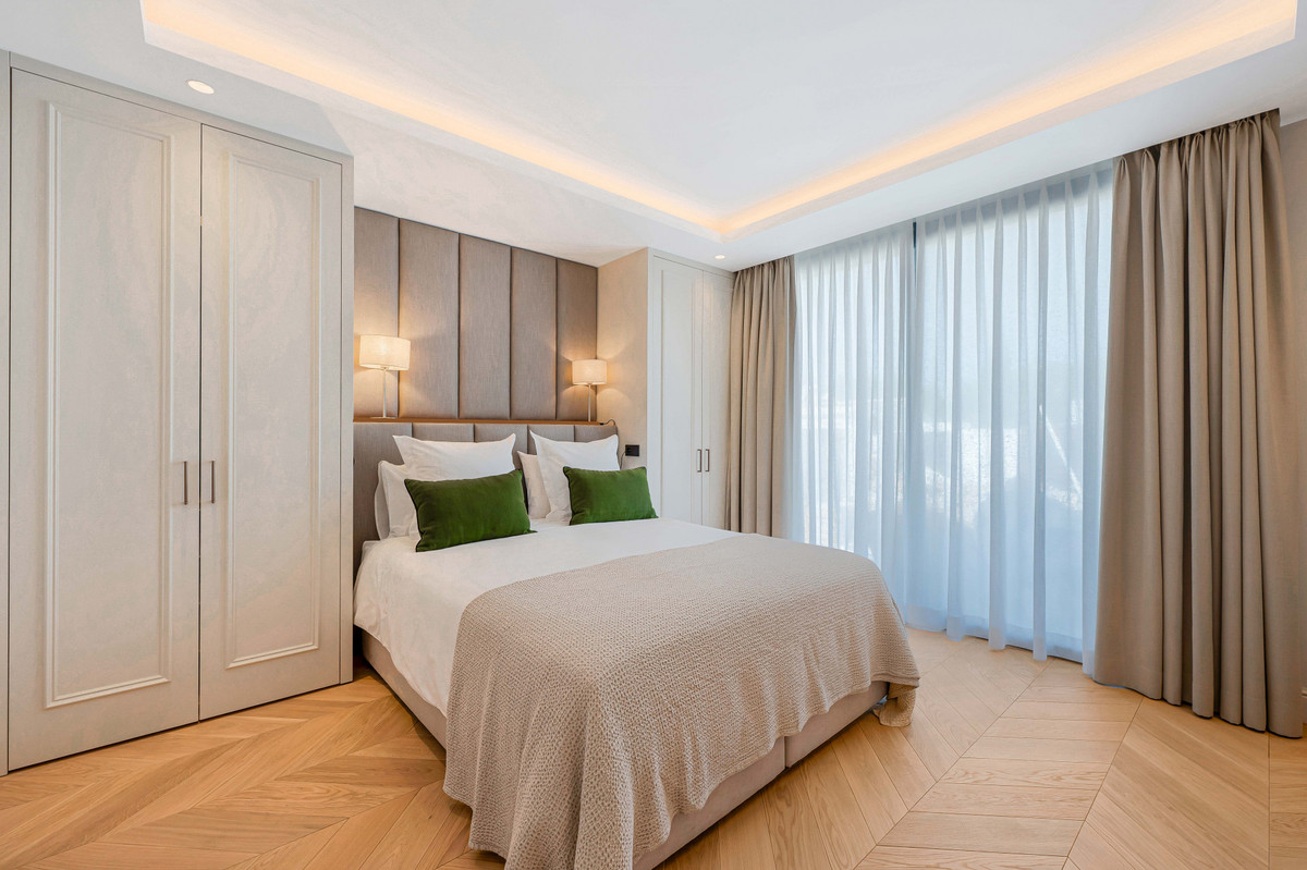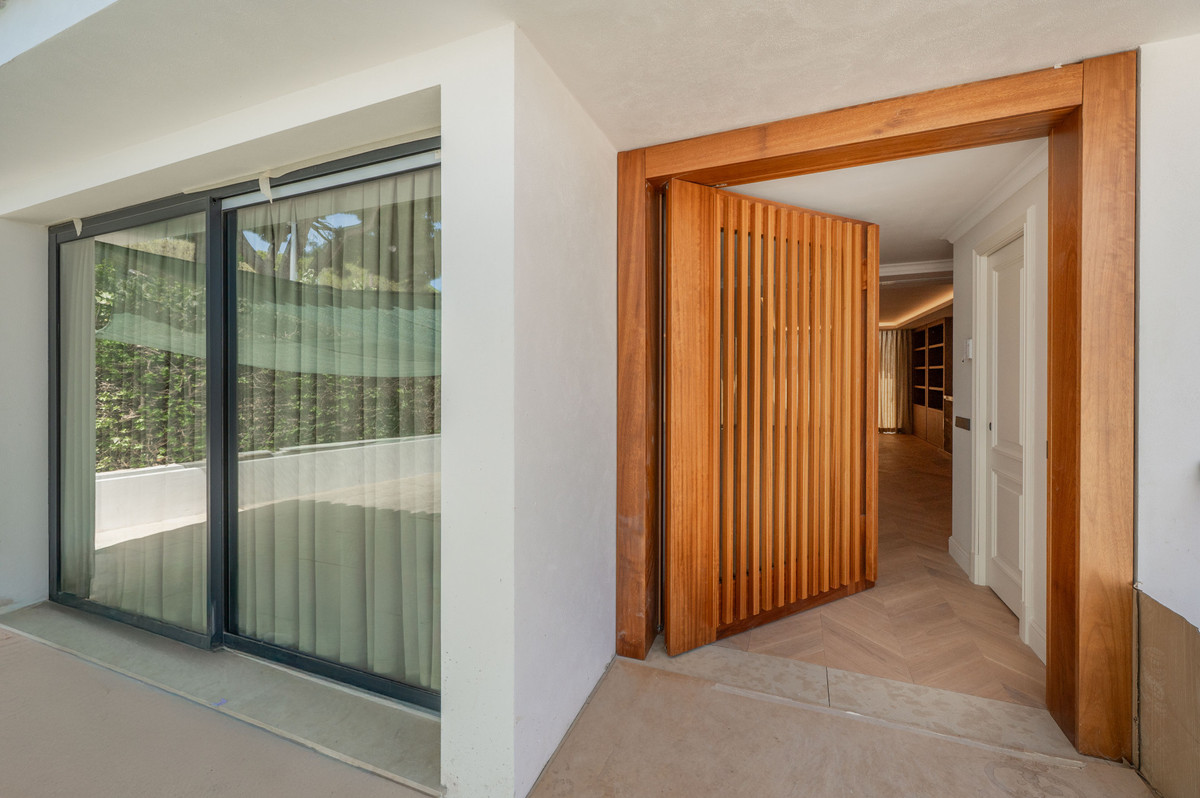 Offering approximately 270 sqm of refined interior living space, complemented by nearly 200 sqm of terraces, including a sundeck with green and sea views, this villa is thoughtfully designed for comfortable family living and sophisticated outdoor entertaining. The main floor features a bright and open-plan layout that seamlessly connects the kitchen, dining, and living areas. The interiors are styled in a neutral palette with elegant wood accents, creating a harmonious blend of modern design and natural warmth. Floor-to-ceiling glass panels on both façades flood the space with natural light and provide a striking line of sight from the entrance hall through to the terrace and beyond.