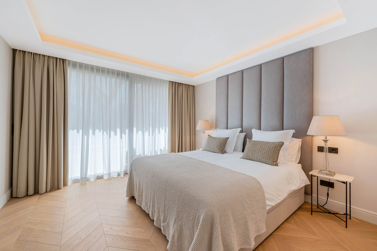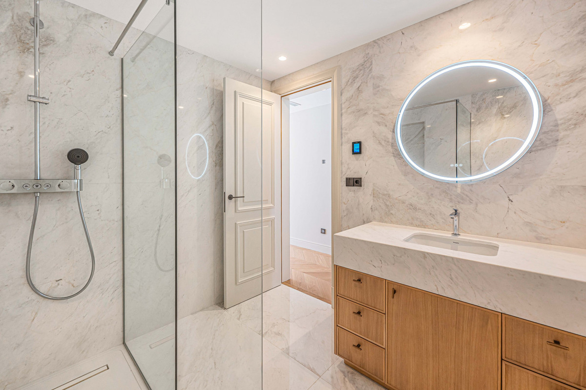The lower ground level, accessible via an interior staircase, enjoys generous ceiling height and natural light thanks to clever architectural planning. Here, you will find a fully self-contained apartment with a spacious fourth bedroom, bathroom, and additional living space, perfect for guests, extended family. This area could easily also be transformed into a fifth bedroom, offering excellent flexibility.