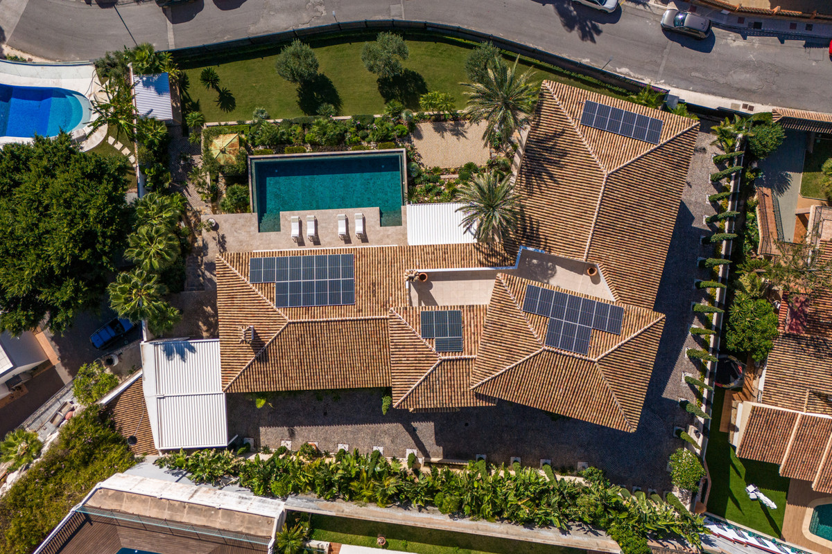 Au niveau inférieur, un studio indépendant offre un hébergement séparé pour les invités ou le personnel, avec une kitchenette et une entrée privée. L'intérieur, lumineux et raffiné, est doté d'un sol en marbre, d'une cheminée et d'une cuisine entièrement équipée. La climatisation et les panneaux solaires garantissent confort et efficacité énergétique tout au long de l'année.