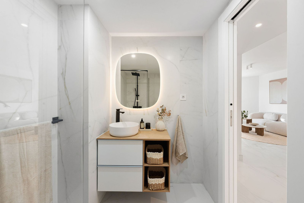 Cet appartement a été entièrement rénové dans un style contemporain. Son intérieur, agencé en espace ouvert, bénéficie d'une luminosité optimale et d'une atmosphère harmonieuse. Le salon, baigné de lumière, s'ouvre sur une cuisine élégante et entièrement équipée, dotée d'électroménagers intégrés et de finitions modernes. La chambre spacieuse offre des placards intégrés et une ambiance sereine, tandis que l'élégante salle de bains présente des équipements haut de gamme et un style épuré et contemporain.