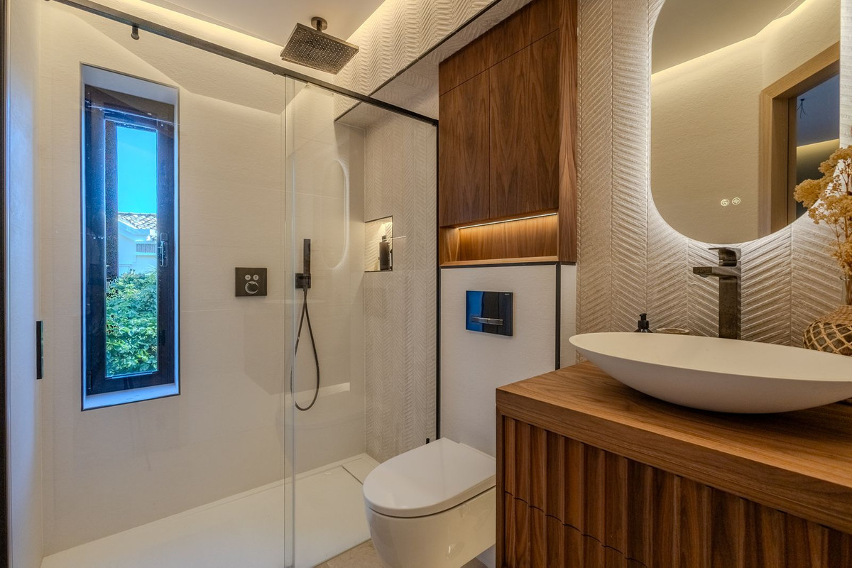Elegant View Residence in La Cerquilla, Nueva Andalucía Located in the prestigious and secure gated community of Aldea Dorada, this semi-detached residence offers the ease of a townhouse with the elevated presence of a penthouse, set in one of Nueva Andalucía’s most exclusive and tranquil locations. From its privileged position, the property enjoys exceptional panoramic views across the Mediterranean Sea, the Golf Valley, and the iconic La Concha Mountain—widely considered among the finest views in Nueva Andalucía and the defining feature of the home. Behind a classic Andalusian façade, the interior reveals a warm and refined Japandi-style renovation, featuring high ceilings, open-plan living spaces, and modern bathrooms that create a calm and elegant atmosphere. The entrance level offers an open living and dining area with a striking suspended fireplace, a discreet office space, and direct access to a partly covered terrace designed to fully embrace the views. The home offers 300 m² built, 76 m² of terraces, and a 300 m² private garden with avocado, mango, and passion fruit trees. A plunge pool on the upper terrace delivers a true penthouse-style outdoor experience. The property comprises four bedrooms and three bathrooms, with excellent potential to create a luxurious master suite with walk-in wardrobe and en-suite bathroom. Additional features include a private gym, two large storage rooms, covered parking for two cars, and lower-level terraces with direct access to the garden. A rare opportunity for buyers seeking a secure, semi-detached luxury home with breathtaking views and effortless maintenance.