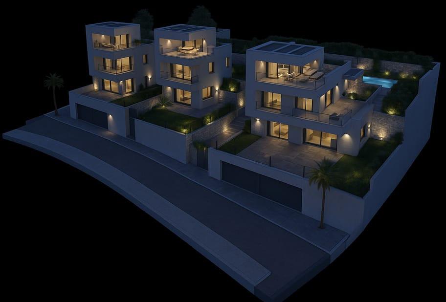 Magnifique villa moderne offrant des vues imprenables sur la mer, la montagne et la ville. Elle comprend un ascenseur privé, un garage, un niveau inférieur modulable pouvant servir de salle de sport, de cinéma ou de chambres supplémentaires, trois suites avec terrasse, un espace de vie ouvert comprenant salon et salle à manger avec cuisine intégrée, des toilettes invités, une véranda, une piscine privée, un jacuzzi et un solarium sur le toit.