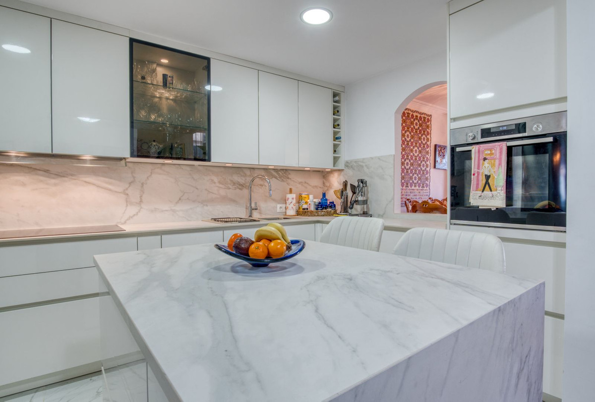 La cuisine a été rénovée avec des meubles haut de gamme, un plan de travail en pierre et des appareils électroménagers modernes entièrement intégrés, alliant style et fonctionnalité. Les trois salles de bains sont restées dans leur état d'origine, offrant ainsi la possibilité d'être rénovées ultérieurement.