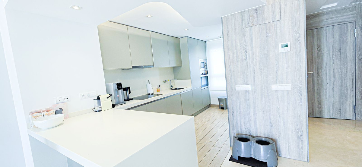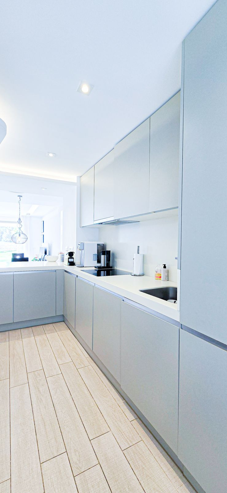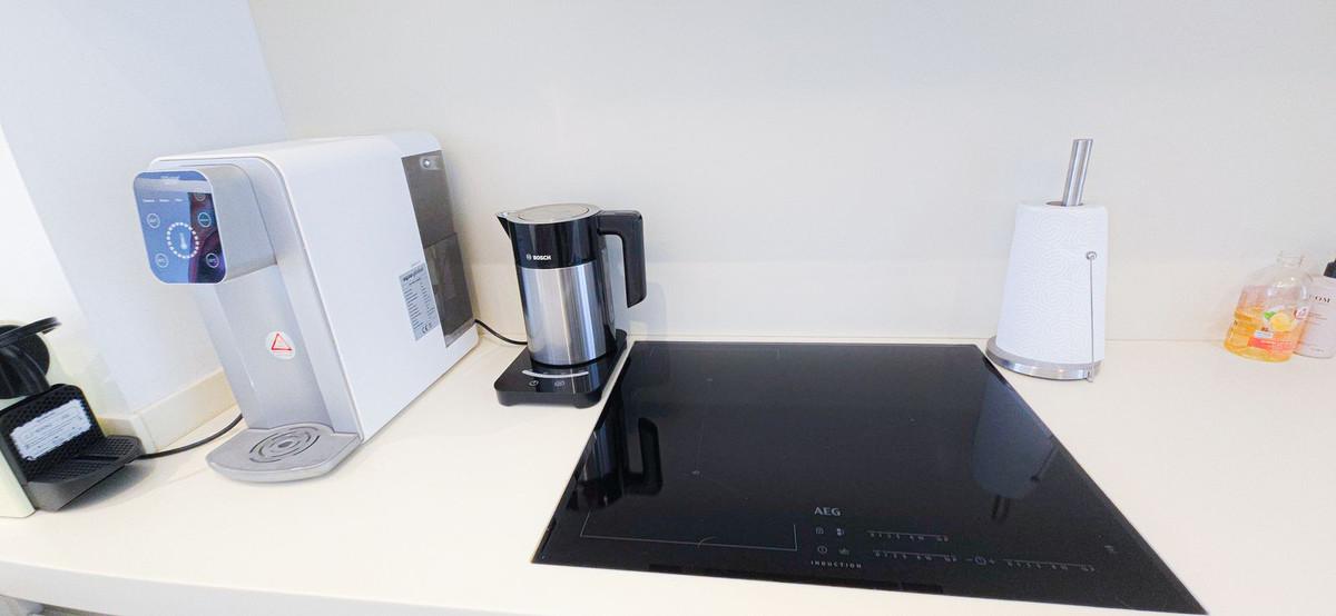 Cuisine haut de gamme : plans de travail élégants en résine, électroménager haut de gamme.