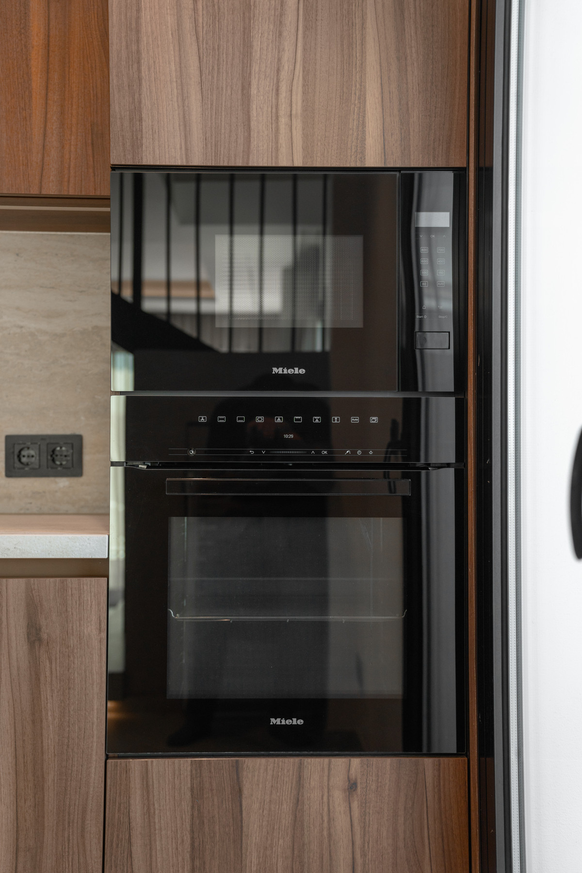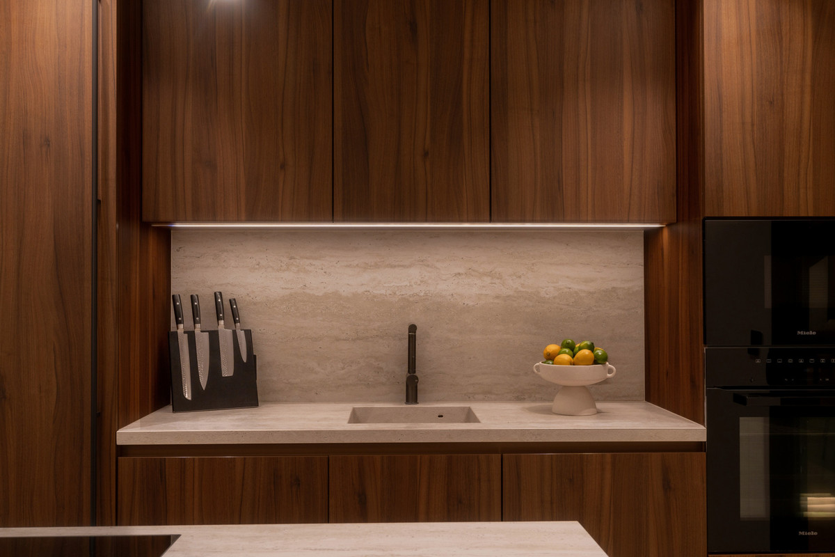 Entering inside, you’ll find three bedrooms, each with its own full bathroom, along with a large dining table and a spacious living area with custom furniture-made by Aldecora.
