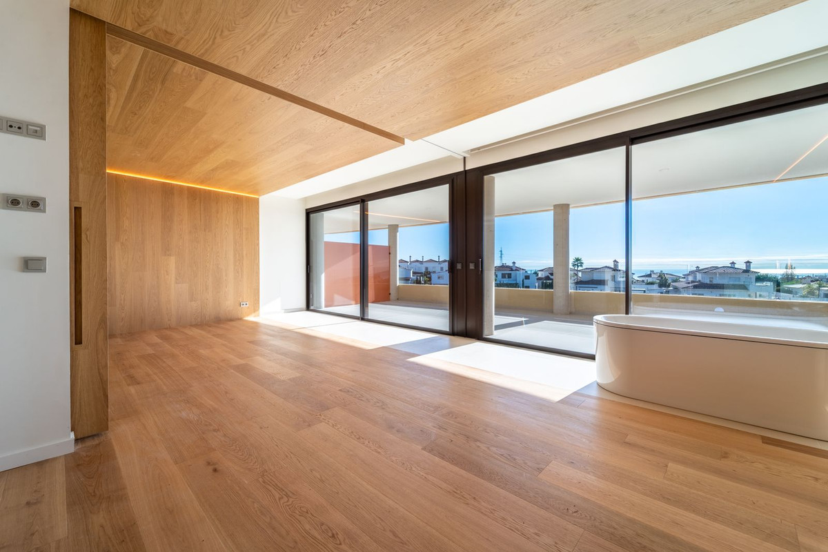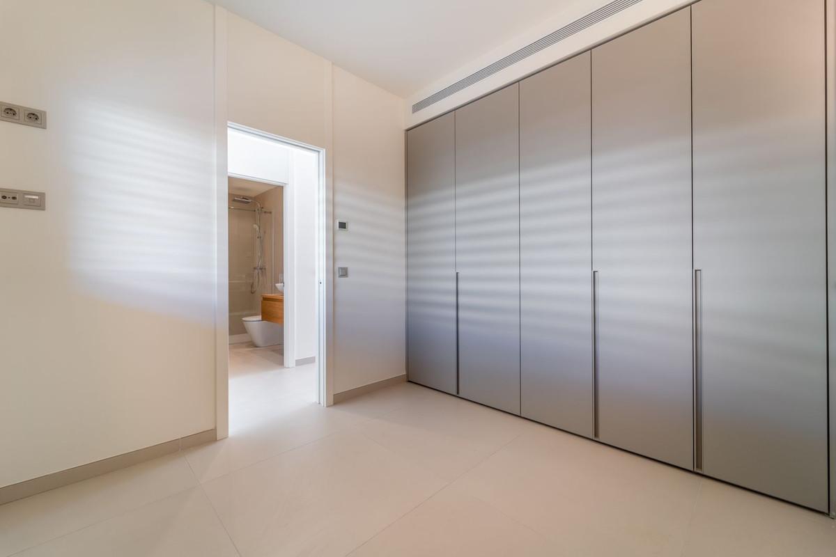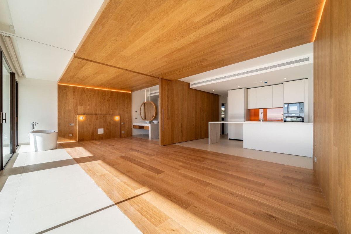 Chambre principale avec salle de bains attenante et dressing. Cet appartement se distingue par son ingénieuse cloison mobile reliant la suite parentale au séjour. Cette longue porte coulissante est conçue pour maximiser l'apport de lumière naturelle et offrir une vue imprenable. Cette fluidité entre les espaces de vie crée un espace ouvert et modulable, idéal pour profiter pleinement du climat et du style de vie du sud de l'Espagne. Cette conception astucieuse optimise la luminosité naturelle de la Costa del Sol dans les deux pièces et vous permet d'admirer la vue splendide depuis chaque recoin de votre appartement. Climatisation réversible, interphone vidéo, domotique, pré-installation pour système d'alarme, système de filtration d'eau, chauffage au sol dans les chambres et les salles de bains. Deux places de parking (dont une avec borne de recharge pour véhicule électrique) et un cellier sont inclus.