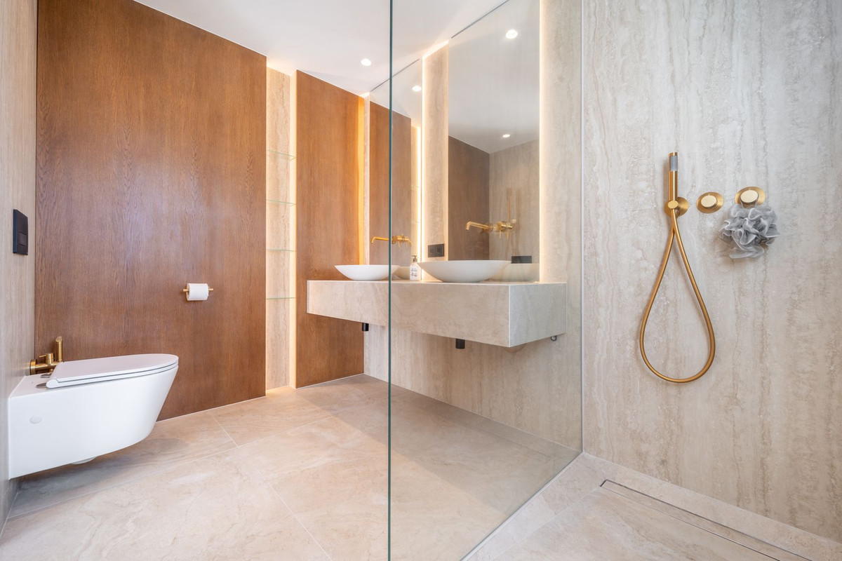 En accédant à la chambre principale de la maison, vous découvrirez une vaste suite parentale avec un dressing quadruple assorti à celui de l'autre chambre. Ce dressing a été soigneusement conçu pour offrir suffisamment d'espace de rangement pour une variété de vêtements, y compris un présentoir à sacs dédié sur le côté droit. Cette chambre bénéficie d'une terrasse privée offrant une vue imprenable sur le golf de Las Brisas. La salle de bains attenante à la chambre principale, conçue avec le même raffinement que les autres chambres, se distingue par un espace accru, des boiseries en chêne massif plus nombreuses et une luminosité naturelle optimale grâce à l'entrée arrière de la propriété. Elle est également équipée d'une double vasque sur le meuble-lavabo.