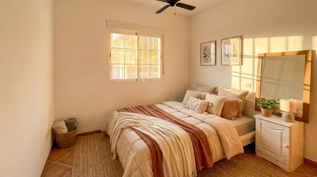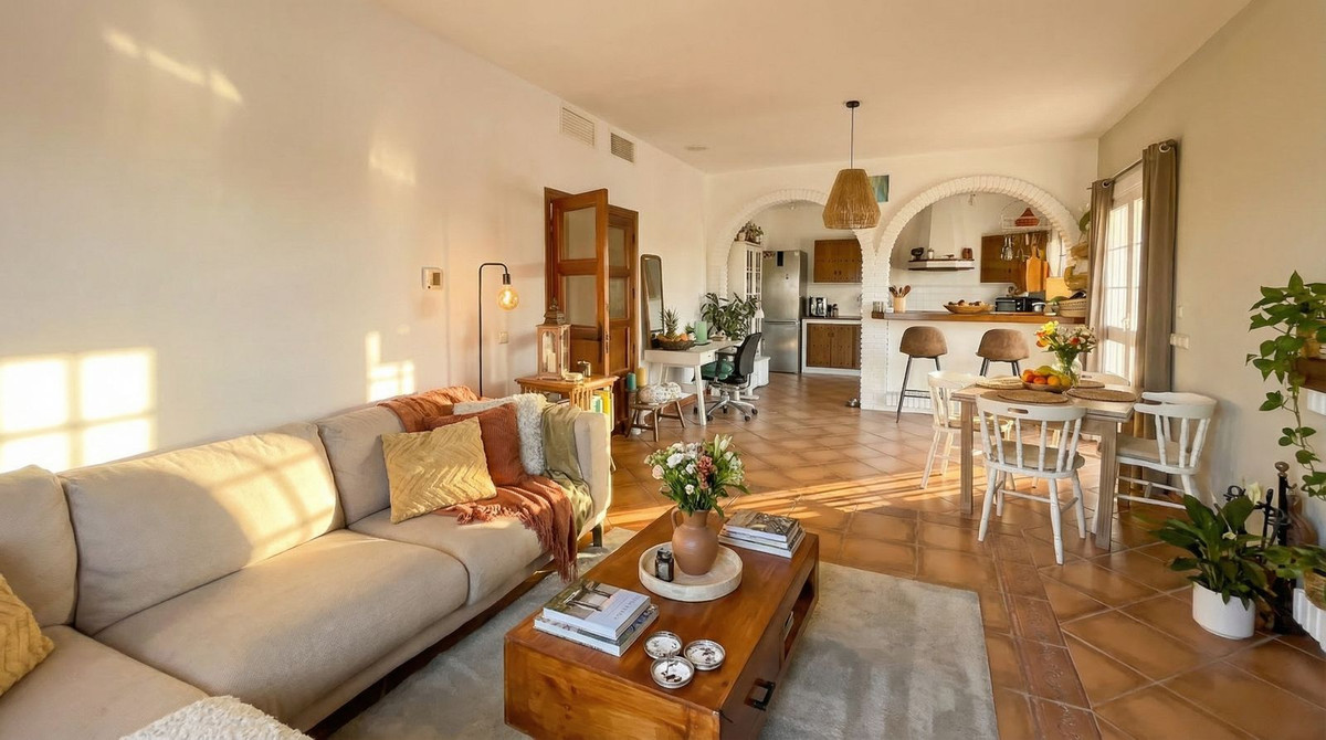 À l'intérieur, la villa dégage un charme andalou chaleureux, avec ses sols en terre cuite et ses élégantes arcades, combinés à un agencement ouvert donnant directement sur la terrasse et la piscine. L'espace de vie se compose d'une cuisine ouverte avec un bar et d'un salon spacieux et accueillant.