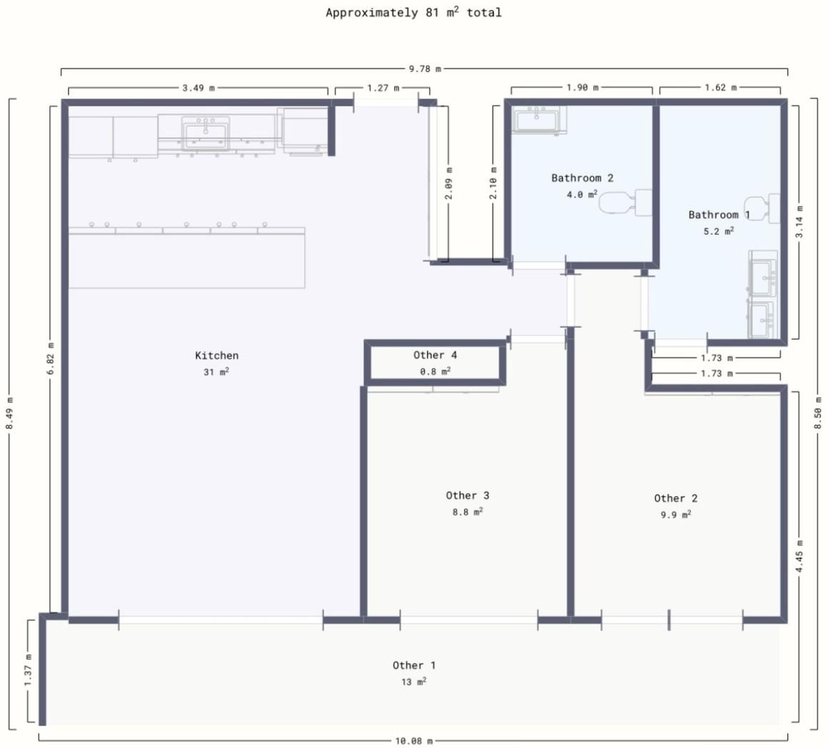 2 chambres, 2 salles de bains, surface construite 90 m², terrasse 24 m².