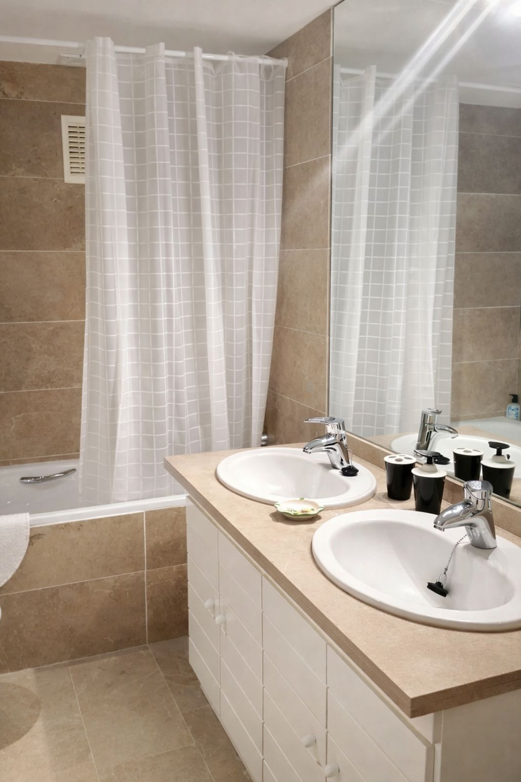 L'appartement comprend trois chambres spacieuses avec lits doubles, dont une suite parentale avec salle de bains privative équipée d'hydromassage et accès direct à une terrasse privée. Il y a trois salles de bains au total.