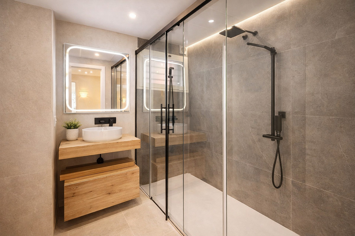 L'appartement dispose de trois chambres spacieuses, toutes dotées de placards intégrés neufs, doublés et éclairés, ainsi que de ventilateurs de plafond et d'une climatisation puissante (8 000 frigories) assurant un confort optimal tout au long de l'année. La chambre principale dispose d'une salle de bains attenante avec douche moderne et accès à un balcon donnant sur l'intérieur du complexe, tandis que les deux autres chambres, dont une actuellement utilisée comme dressing, partagent une seconde salle de bains complète. Les deux salles de bains se distinguent par leur rénovation complète et leurs finitions haut de gamme, chacune dotée de fenêtres extérieures assurant une ventilation optimale. Elles sont également équipées de parois de douche coulissantes en verre conçues pour offrir confort et élégance.