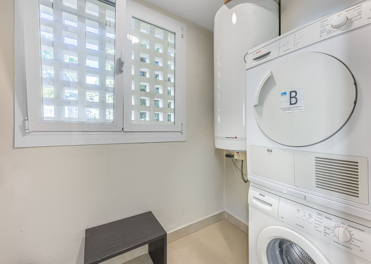 L'appartement comprend trois chambres, toutes avec accès à la terrasse, un vaste séjour/salle à manger offrant une vue imprenable, et une cuisine entièrement équipée avec buanderie. Deux chambres partagent une salle de bains, tandis que la chambre principale dispose d'une salle de bains privative. La terrasse est couverte, vous permettant ainsi de profiter de la vue exceptionnelle en toute saison.
