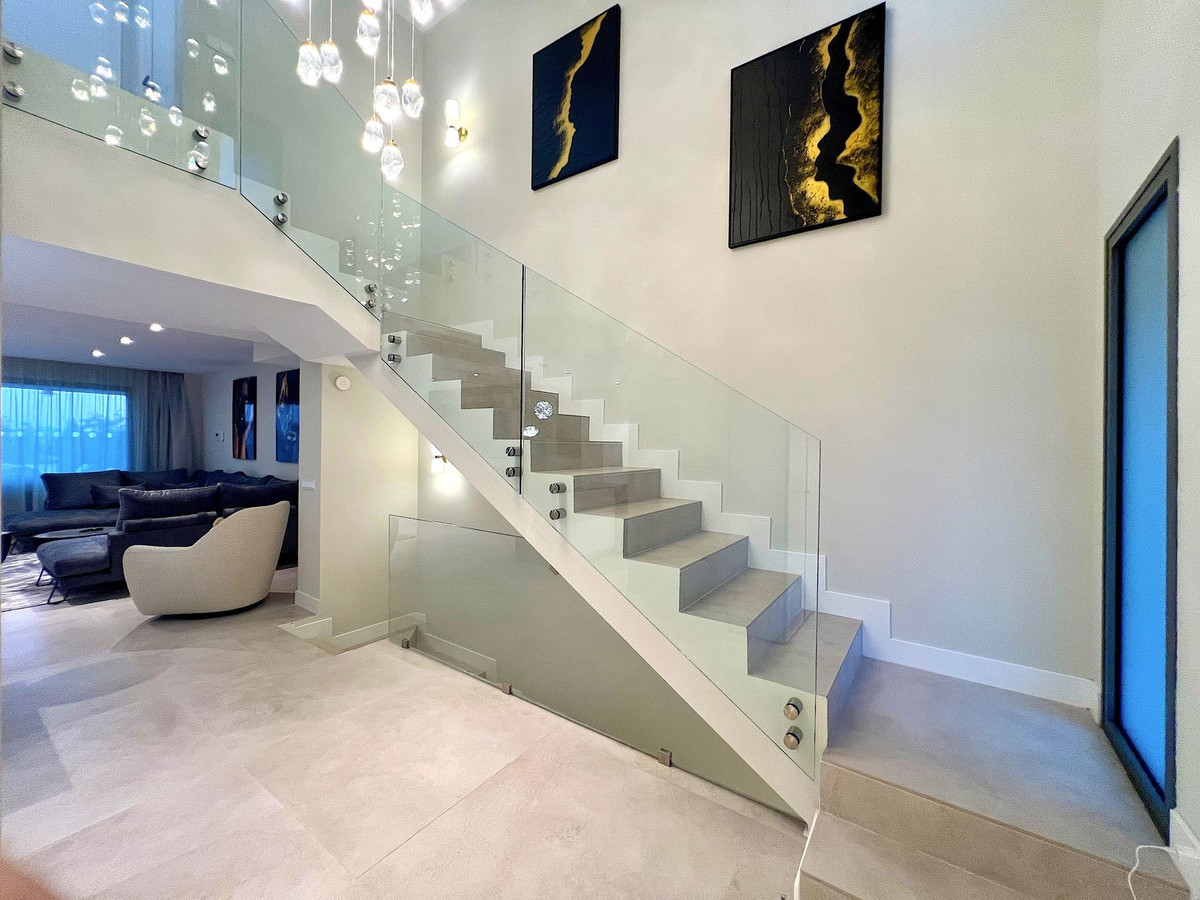 Un élégant escalier en verre mène au niveau inférieur, où se trouvent la buanderie, un débarras et un garage privé. Ce complexe résidentiel de standing propose une salle de sport, une piscine, des courts de tennis, un putting green et un service de conciergerie.