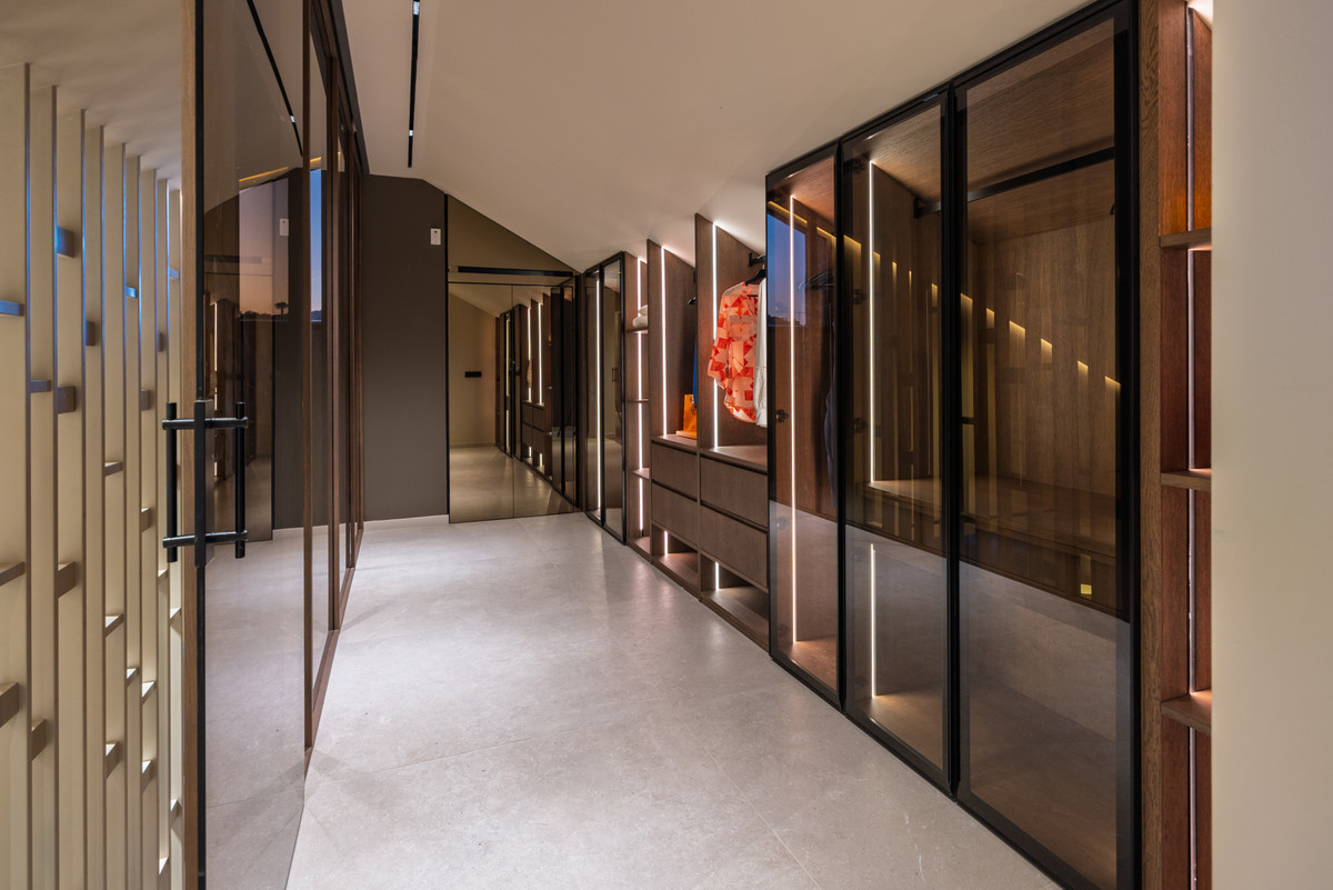 La villa comprend cinq chambres soigneusement décorées et six salles de bains modernes, dont cinq en suite. À l'étage, l'impressionnante suite parentale est un véritable havre de paix avec son spacieux dressing en bois, ses portes vitrées et ses fenêtres offrant une vue dégagée sur la vallée du golf.