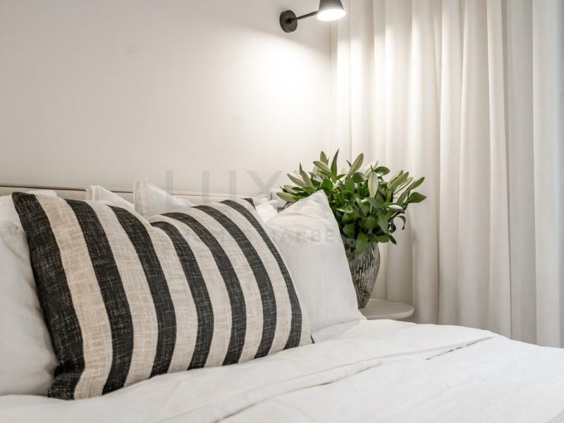 The property offers two comfortable bedrooms, each with its own beautifully finished bathroom. The entire apartment features a brand-new stylish floor and plenty of smart storage solutions, including custom-made wardrobes. There is also a separate storage and laundry area with extra cupboards and a neatly integrated built-in washing machine.