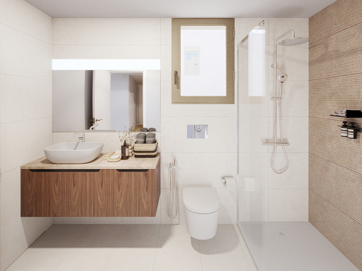 High-quality materials are used throughout, including large-format porcelain flooring, laminate wood floors in the bedrooms, and underfloor heating in the bathrooms. Homes are spread across several levels, with options such as a private elevator, swimming pool, solar panels, two private parking spaces, and generous storage areas.