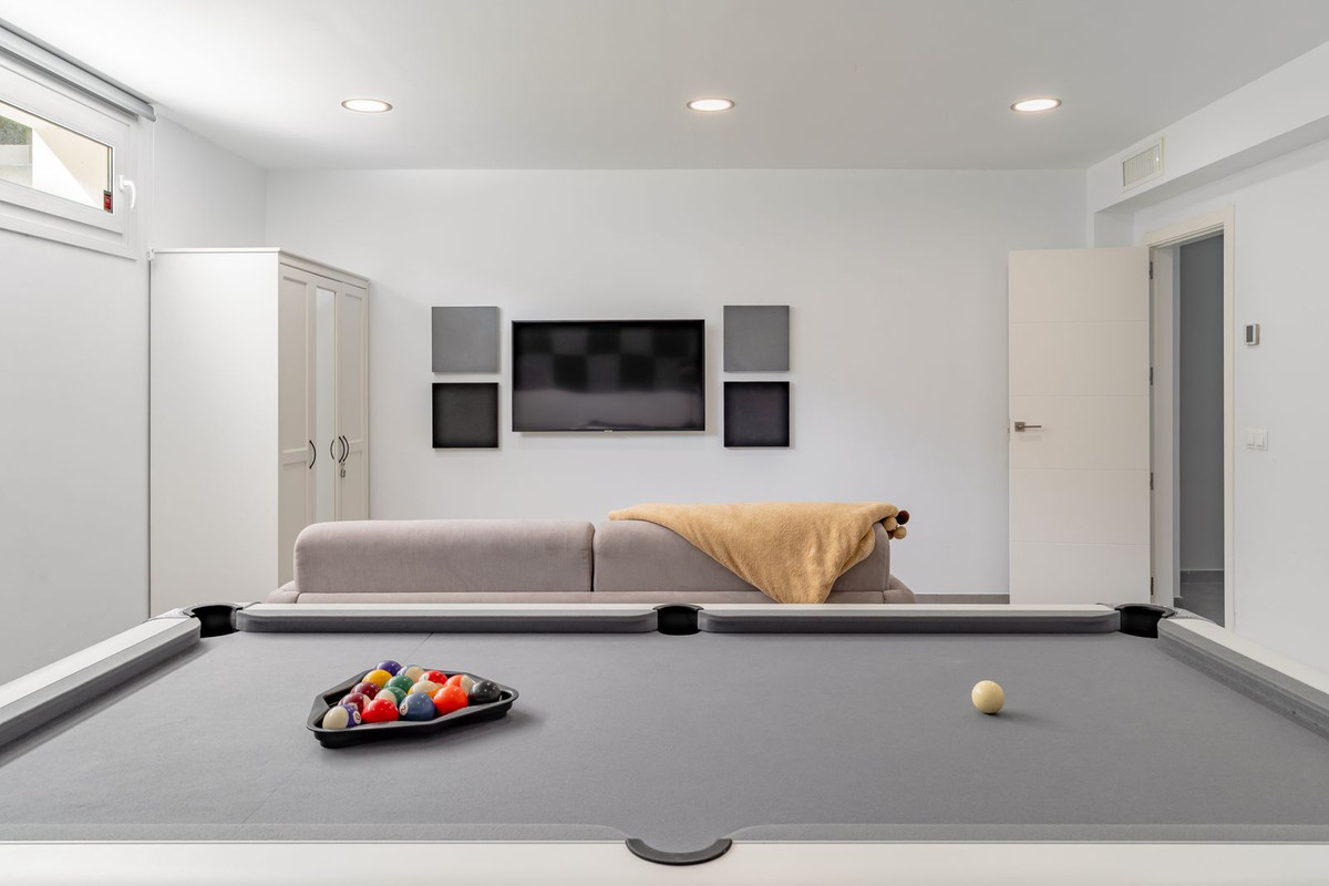 The lower floor houses a leisure area with a games room equipped with a billiard table and cinema space, as well as two additional bedrooms and a complete bathroom, ideal for guests or family members.