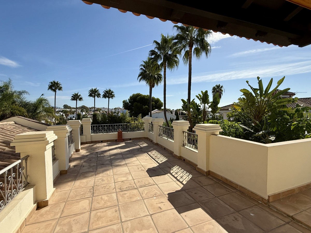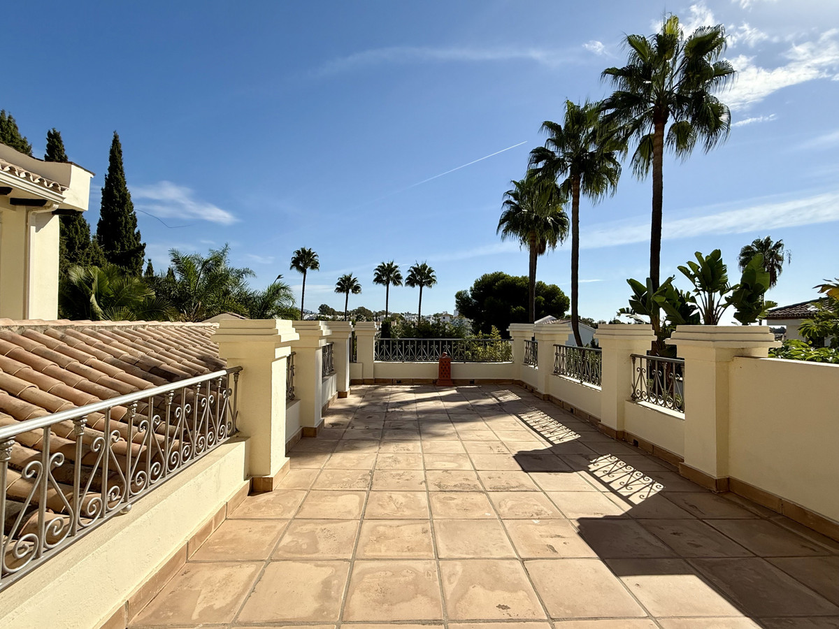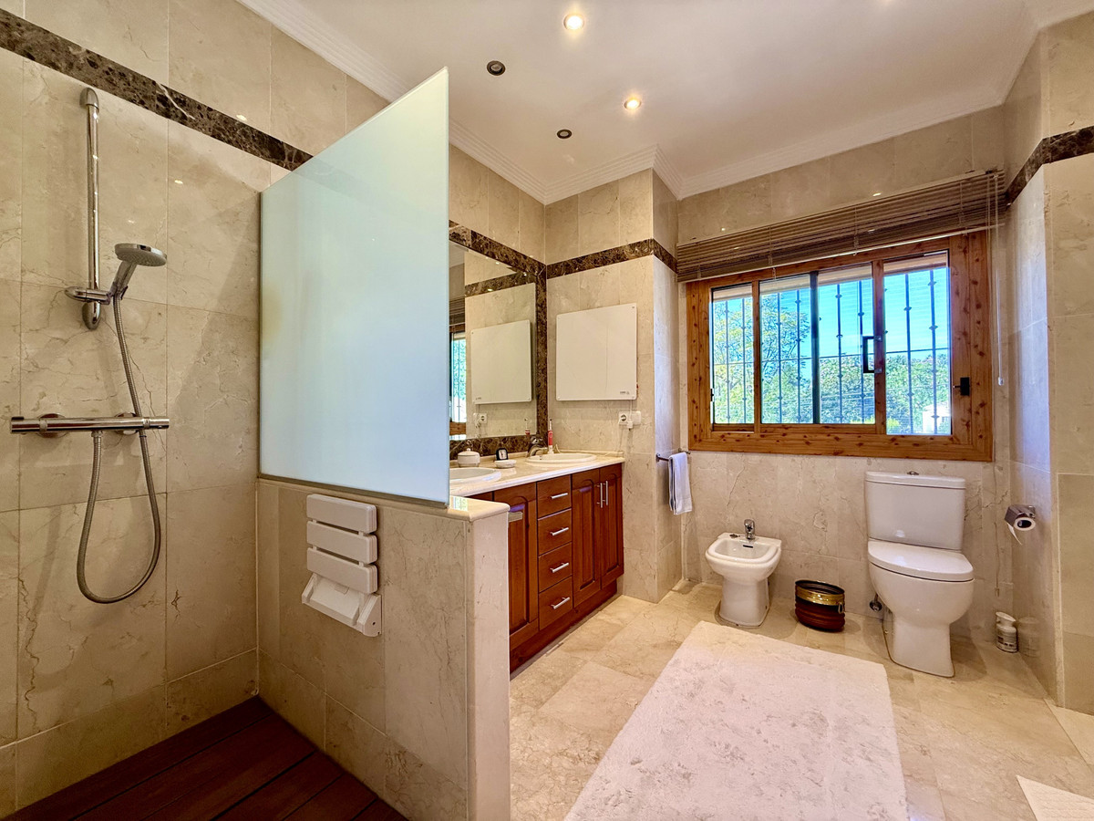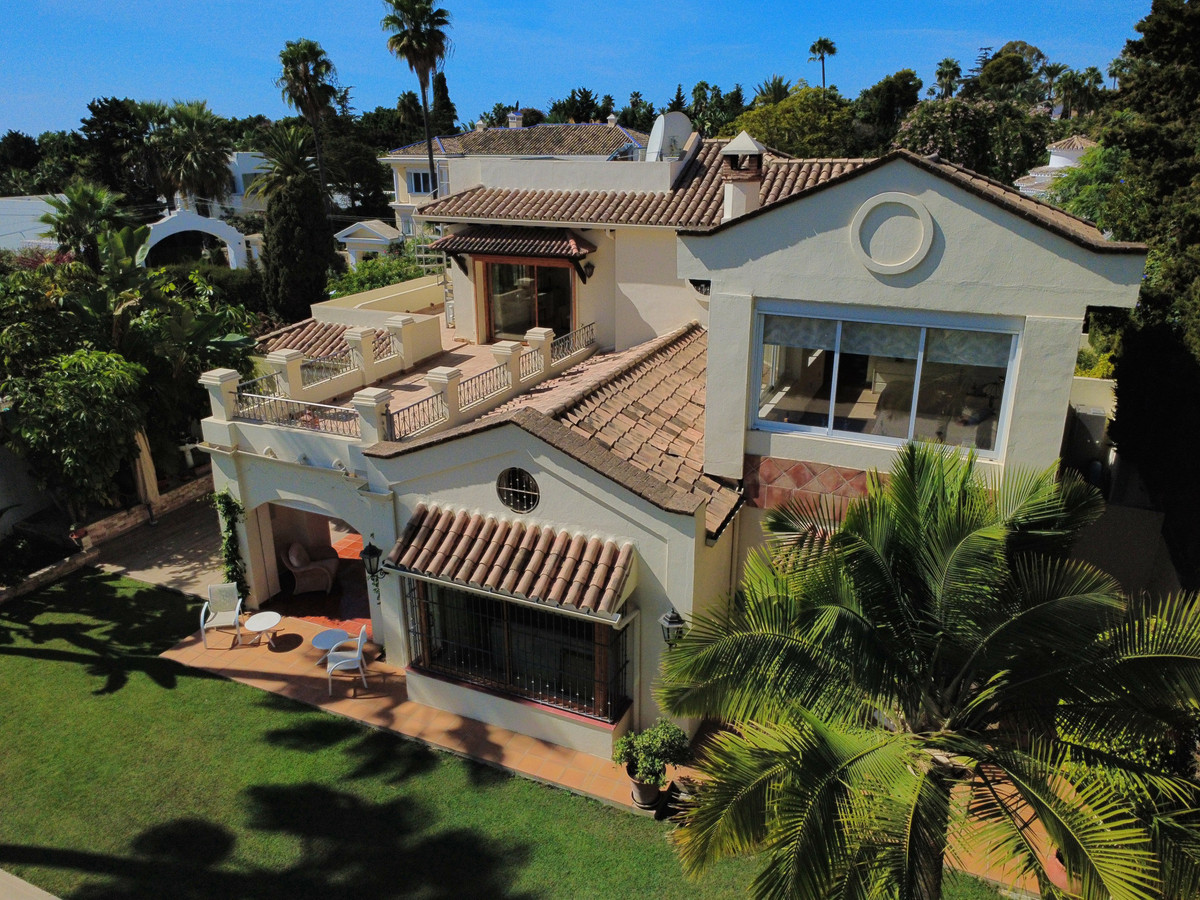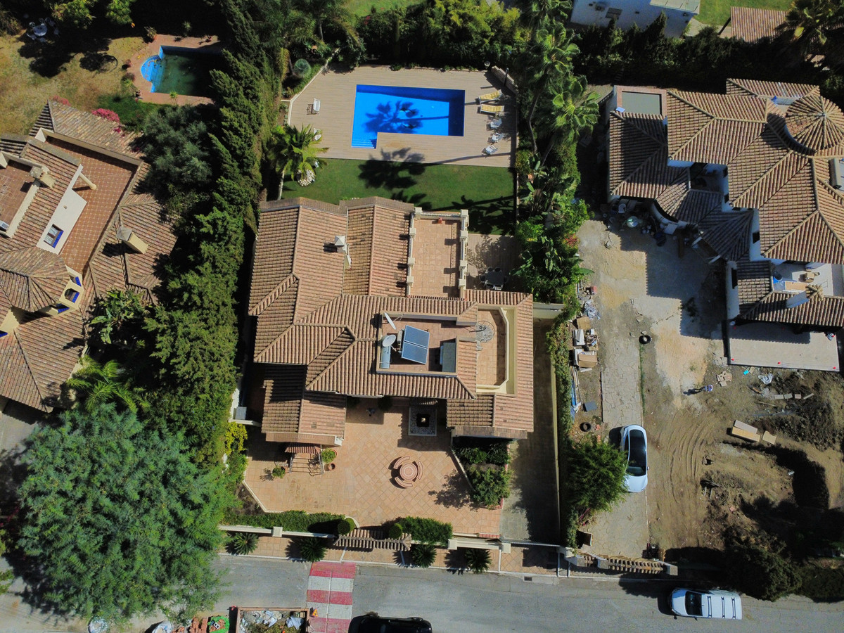 Cette superbe propriété est désormais disponible à un prix très compétitif. Son emplacement idéal, à proximité immédiate de plusieurs centres commerciaux, la rend particulièrement attrayante pour ceux qui souhaitent profiter des commodités (restaurants, supermarché, pharmacie, salle de sport, cafés, etc.) sans utiliser leur voiture. La propriété est en excellent état. La villa présente un élégant style andalou. Le hall d'entrée dessert, sur la droite, la salle à manger séparée, la cuisine entièrement équipée et la grande terrasse, couverte et découverte, donnant sur un jardin paysager arboré et très privé avec piscine. Le spacieux salon bénéficie d'une belle hauteur sous plafond avec poutres apparentes. Au même niveau se trouvent deux chambres avec salle de bains privative. Un bel escalier mène au premier étage où se trouvent une grande chambre très lumineuse et la suite parentale avec salle de bains privative et accès à une grande terrasse ensoleillée offrant une vue imprenable sur les montagnes. Au sous-sol, vous trouverez une salle de jeux, une salle de loisirs avec salle de bains et un très grand garage pouvant accueillir plusieurs voitures, ainsi qu'une buanderie. Cette magnifique propriété familiale bénéficie d'un superbe jardin arboré et d'une charmante entrée. Des écoles internationales comme Atalaya et San José in Guadalmina sont à proximité immédiate. La proximité de toutes les commodités, notamment plusieurs terrains de golf tels qu'El Paraiso, Atalaya ou Los Flamingos, la plage à 15 minutes à pied, et le charmant club sportif El Campanario avec sa superbe piscine intérieure, sa salle de sport, son spa et bien plus encore, font de cette maison un lieu de vie familial exceptionnel. Une visite s'impose.