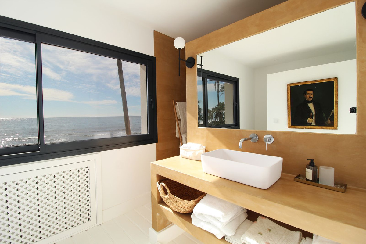 Villa d'exception située en bord de mer dans le prestigieux domaine privé de Casasola, à Guadalmina Baja. Récemment rénovée et exposée plein sud, cette propriété offre une vue panoramique imprenable sur la Méditerranée, avec l'Afrique et Gibraltar à l'horizon. La maison, d'un style à la fois contemporain et typiquement ibicenco, s'étend sur un terrain de 2 300 m². Son agencement fonctionnel s'articule autour de deux cours centrales, baignant ainsi la maison de lumière naturelle. Le séjour se divise en deux espaces distincts, avec un coin salon cosy doté d'une cheminée attenant à la pièce principale. Ce dernier mène à la salle à manger pouvant accueillir confortablement au moins 10 convives. Le séjour et la salle à manger donnent tous deux accès à une immense terrasse couverte, qui s'ouvre sur un vaste jardin et une piscine. La superbe cuisine en L, agencée avec soin, est équipée d'appareils Siemens. Une buanderie séparée se trouve également à proximité. Le rez-de-chaussée comprend six suites, dont deux avec accès direct au jardin et à la piscine. Deux chambres de service sont situées à l'arrière de la propriété. L'étage supérieur comprend la suite parentale, deux salles de bains, de nombreux rangements et un solarium offrant une vue imprenable sur le rivage et le bruit des vagues. La résidence est sécurisée 24h/24 et se situe à quelques minutes en voiture de San Pedro et de Puerto Banús.